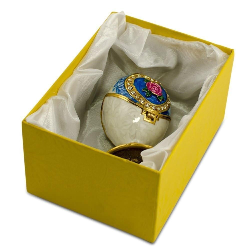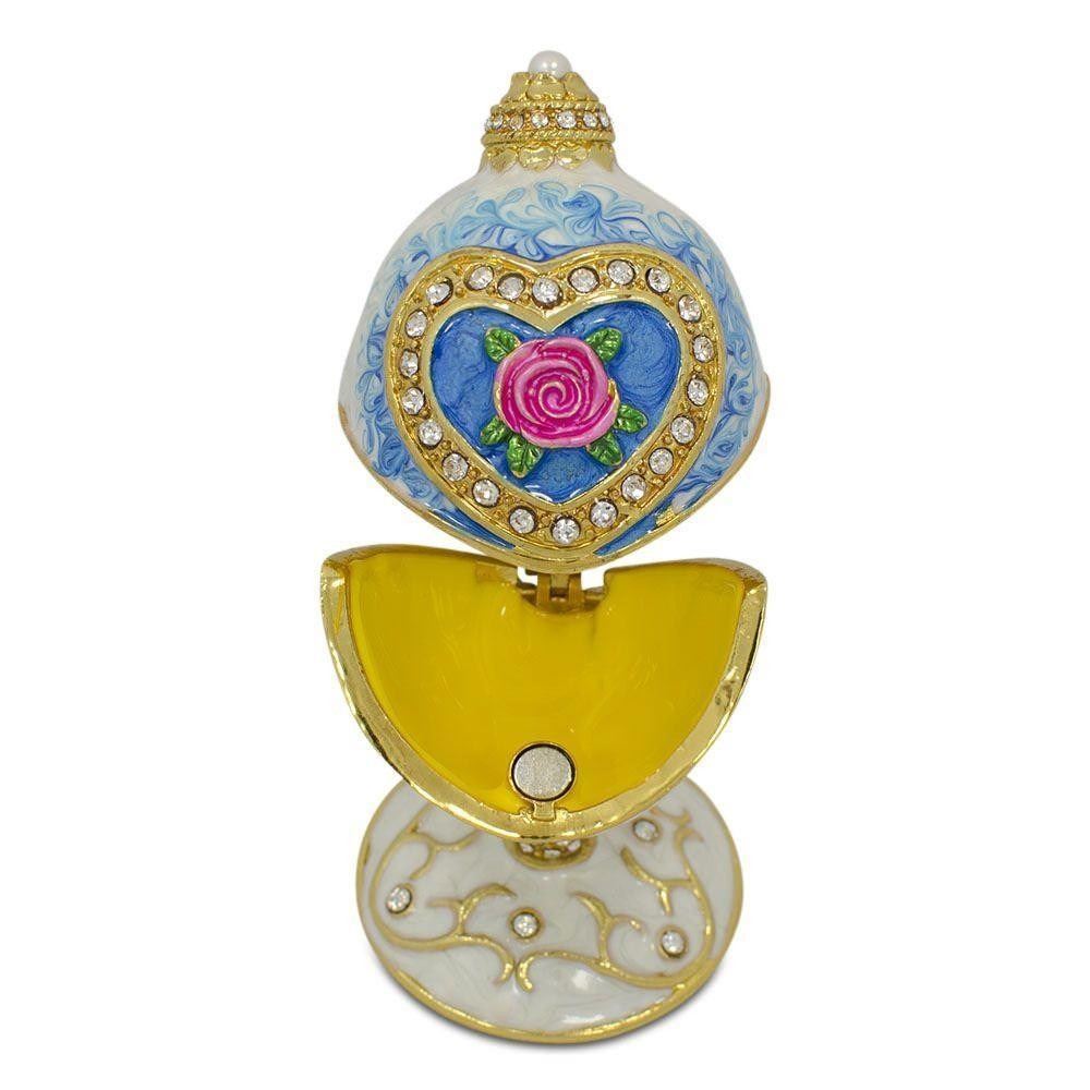 3.25" Rose in Crystal Valentine's Heart Russian Royal Inspired Easter Egg This sparkling egg trinket box is adorned with clear crystals and high-polished enamel with golden trim. It opens on a hinge and has a magnetic closure to keep the box securely shut. The piece also comes in a beautiful gift box. Celebrate this springtime or Easter with the 3.25" Rose in Crystal Valentine's Heart egg. This sparkling egg is accentuated with golden trim, brilliant crystals, a rose, and is further hand-enameled. It comes in attractive gift box.  3.25 Inches Tall x 1.75 Inches Diameter Pewter, Crystals, Enamel Gift Boxed Â