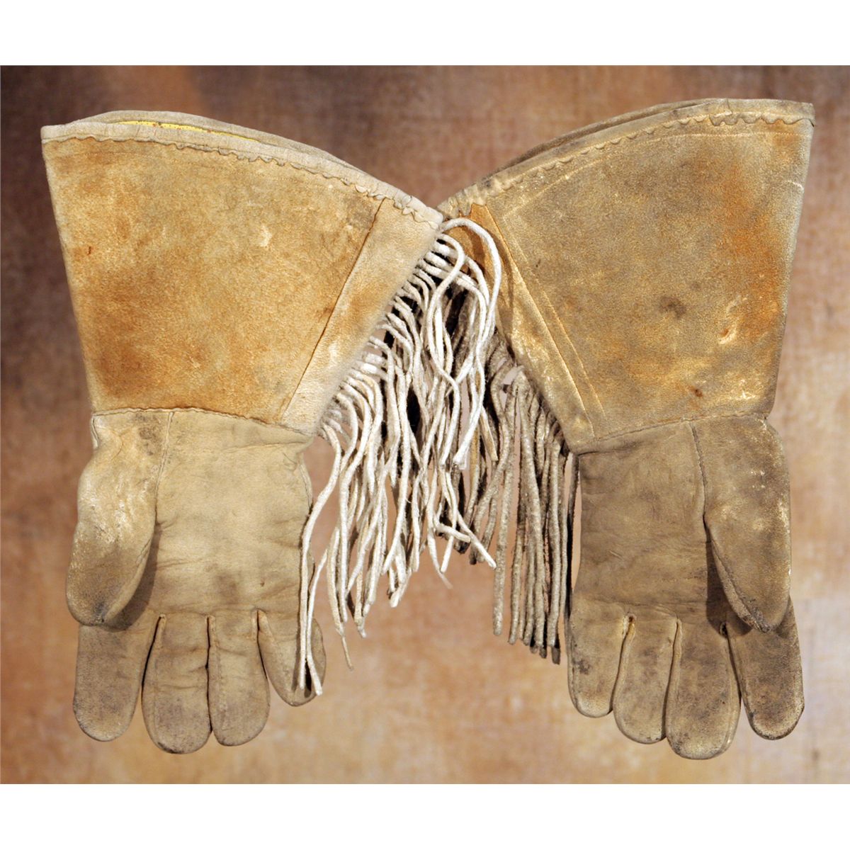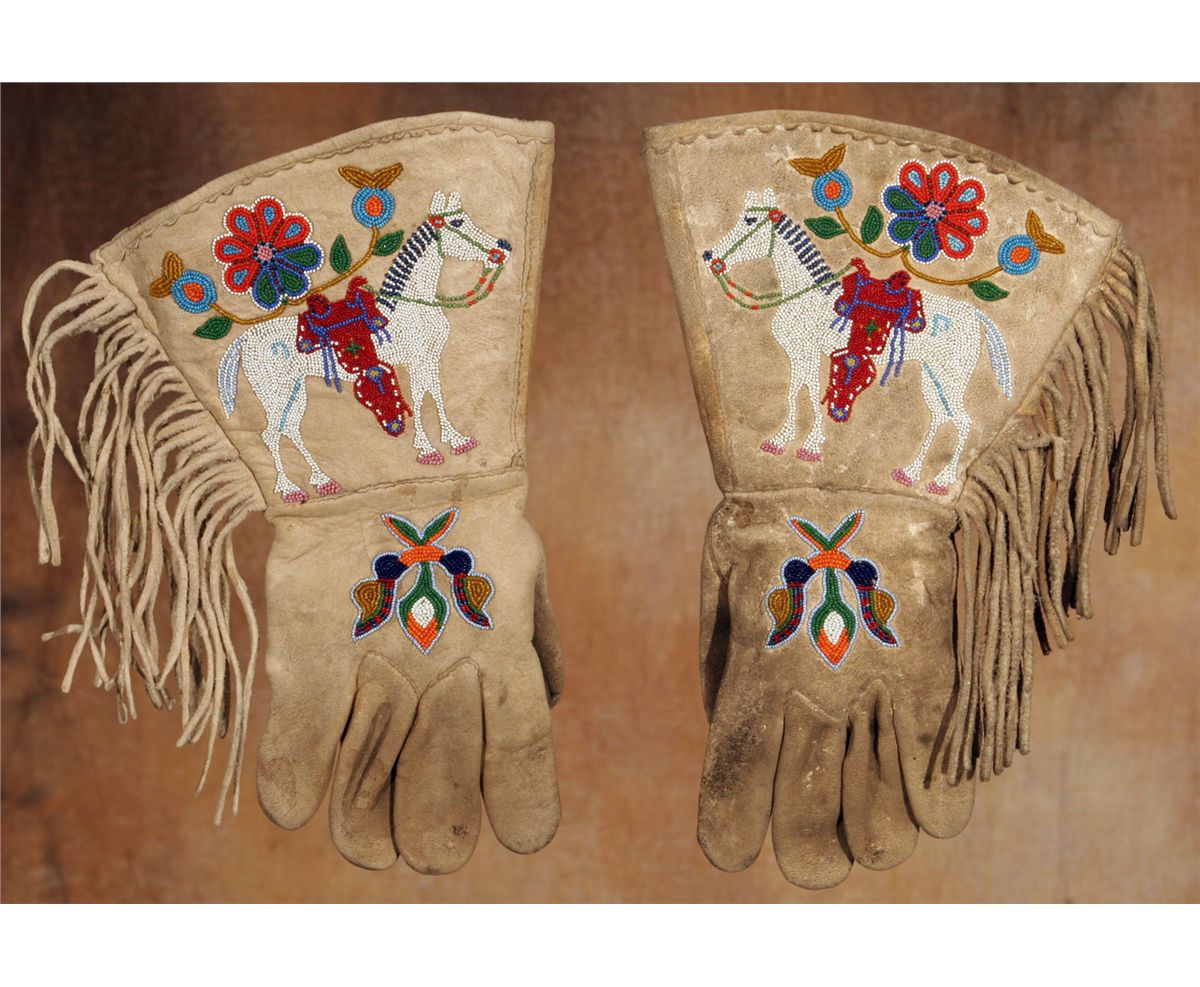 Rosebud Sioux Gauntlets. 14" long, 5" fringe. Desirable pictorial designs of a white horse (branded) with a fancy red saddle, as well as traditional colors and floral designs. Indian tanned hide. Lined with trade cloth. Circa 1930s. Provenance: Ex-Wintersteen collection.