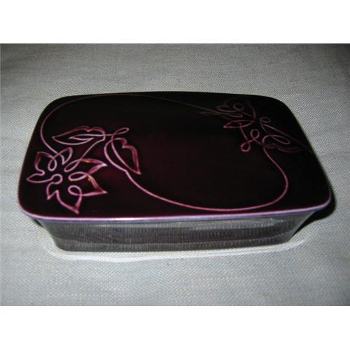 This lovely box is collectible and has signature on the base Roselane 34 with label inside the lid Roselane Pasadena Registered Calif. with Logo of roselane on the label. It is in very good condition w minor imperfection chip on the top left. This box is 2 inch in height, 6.75 inch in width, and 4.5 inch fron the sides. It has floral motif and gorgeous eggplant color Exterior, off white color interior. Would make a wonderful Vanity Accessory. Very Collectible!