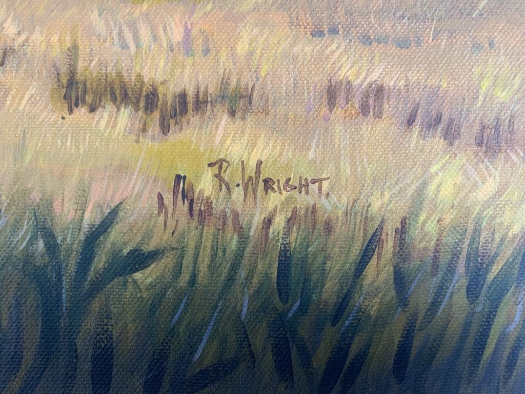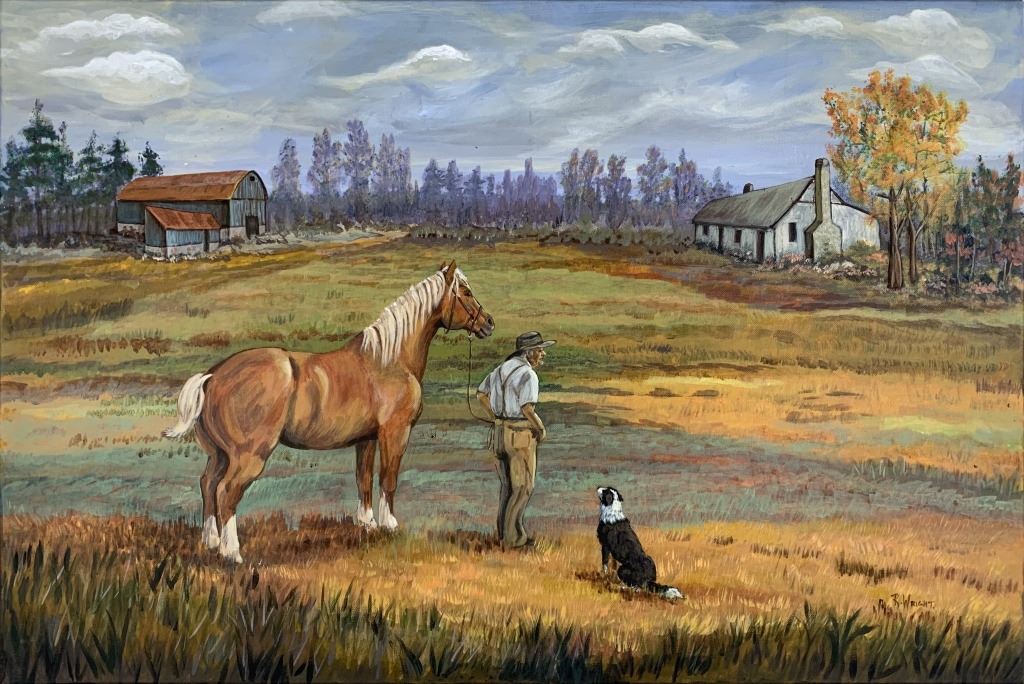 Rosemarie Wright's "Wait" original acrylic on canvas painting. This has been stretched over a stretcher board, but is not framed. This is of a farmer with his horse and his dog on his farm, staring off into the distance.