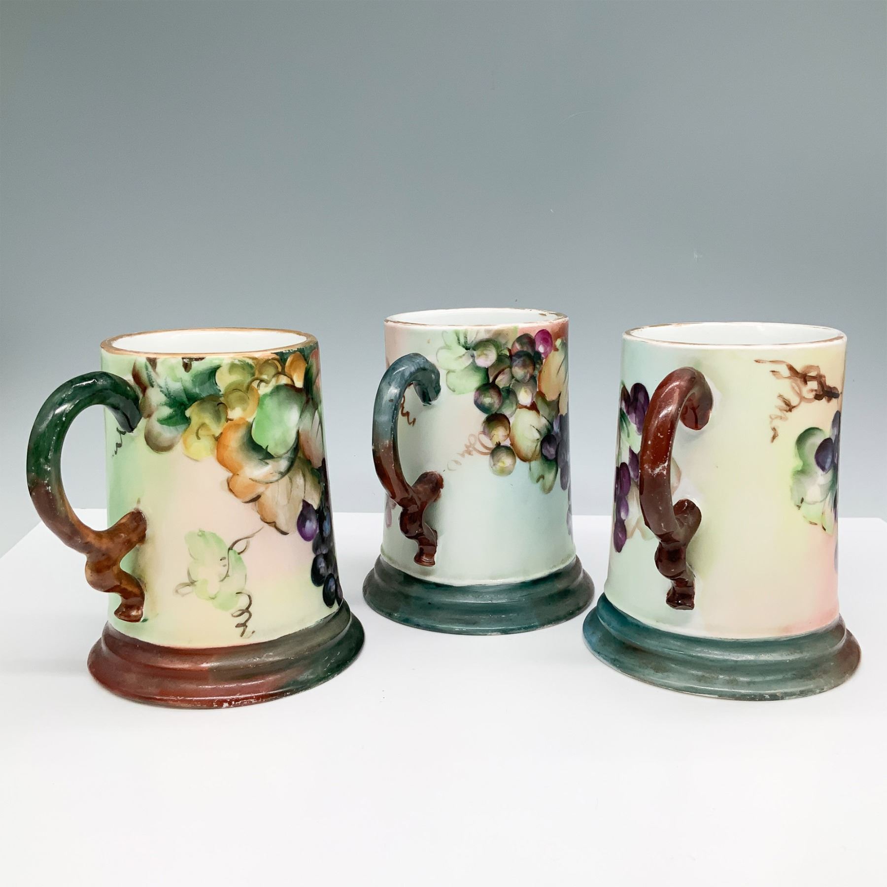 Rosenthal three-piece hand-painted porcelain tankard set featuring a vibrant grapevine motif. Each tankard showcases meticulous artistry with rich hues of purple and green grapes against a soft pastel background, complemented by branch-like handles. Manufactured by Rosenthal in Bavaria, Germany, the set bears the Rosenthal crown Bavaria backstamp on the underside. A fine example of early 20th-century porcelain craftsmanship, ideal for collectors.