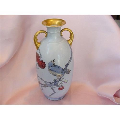 Very decorative light blue hand painted vase with blue bird on a berry branch. Vase measures 10 1/2" tall and approximately 4 3/4"wide. Nicely painted in shades of blue, blue-gray, and deep red. Signed "FJ" on front. Gilded rim and handles. Base has the green mark with a crown and an "R" and "C" on each side of cross and "Bavaria" below. Circa 1900. Excellent condition.