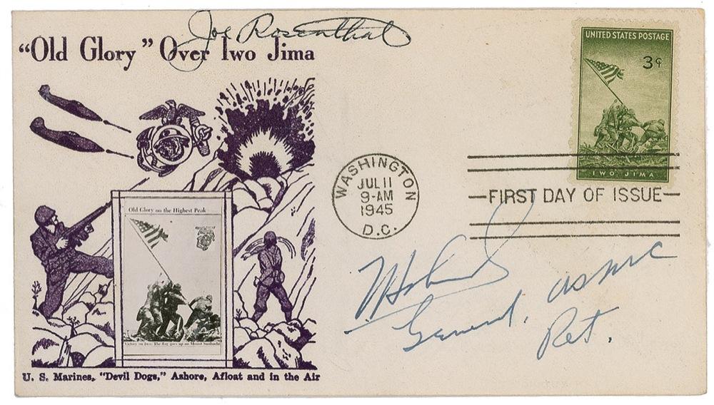 Joe Rosenthal and General Thomas Holcomb signed first day cover with a cachet honoring ''Old Glory'' over Iwo Jima. Signed in black ballpoint by photographer Joe Rosenthal and blue fountain pen by Marine Corps General Thomas Holcomb, who has added, ''General, USMC Ret.'' beneath his signature. Measures 6.5'' x 3.5'' postmarked 11 July 1945. In very good condition, with scattered toning and surface wear.