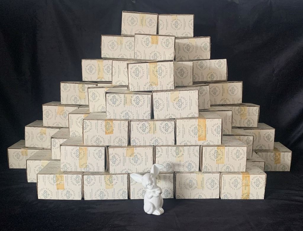 A large collection of Rosenthal "Laughing Hare" porcelain figurines, all in their original boxes. The vast majority are still sealed with the original tape from Rosenthal. There are a total of 71 figurines, all in pristine condition.