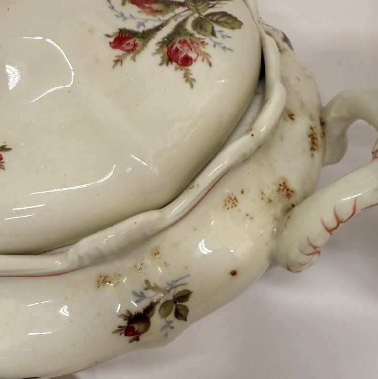 Item/Description: Featuring a Rosenthal Moss Rose Pompadour 19-piece floral porcelain china set, including serving dishes, coffee cups, and a coffee pot with lid. Made in Germany.