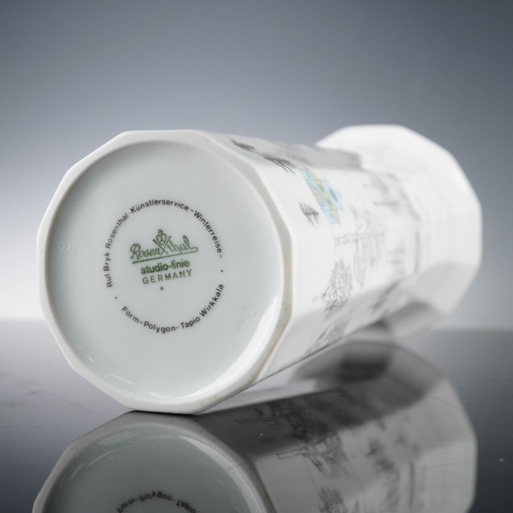Rosenthal Studio-Linie porcelain vase, designed by Tapio Wirkkala in the Polygon form and decorated by Rolf Brix with the Winterreise pattern. The tall, flared cylindrical body features a delicate landscape of bare winter trees and houses in subtle grey and pale blue tones, evocative of a serene snowy scene. Marked to the base Rosenthal Studio-Linie Germany, Form Polygon, Tapio Wirkkala, and Winterreise by Rolf Brix.