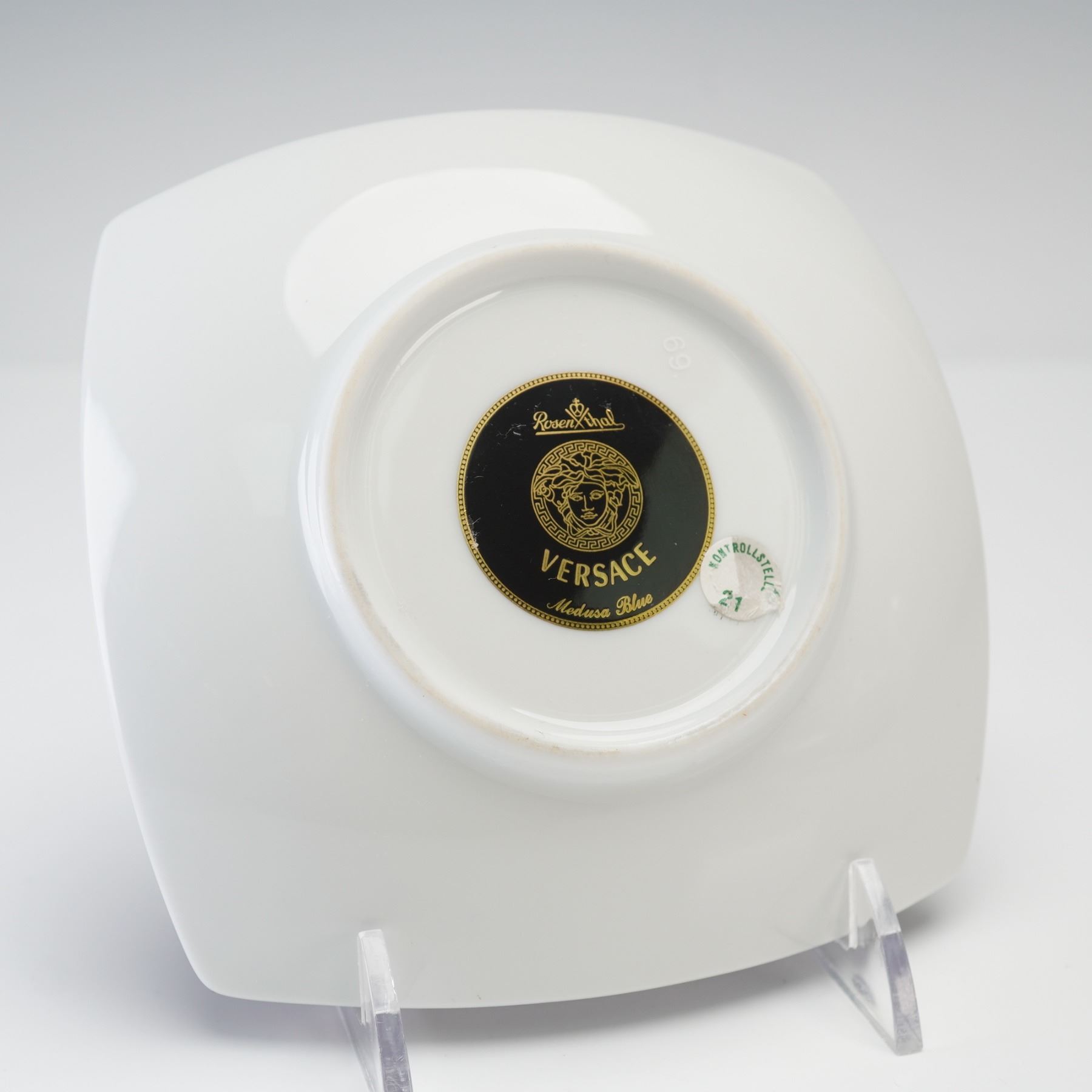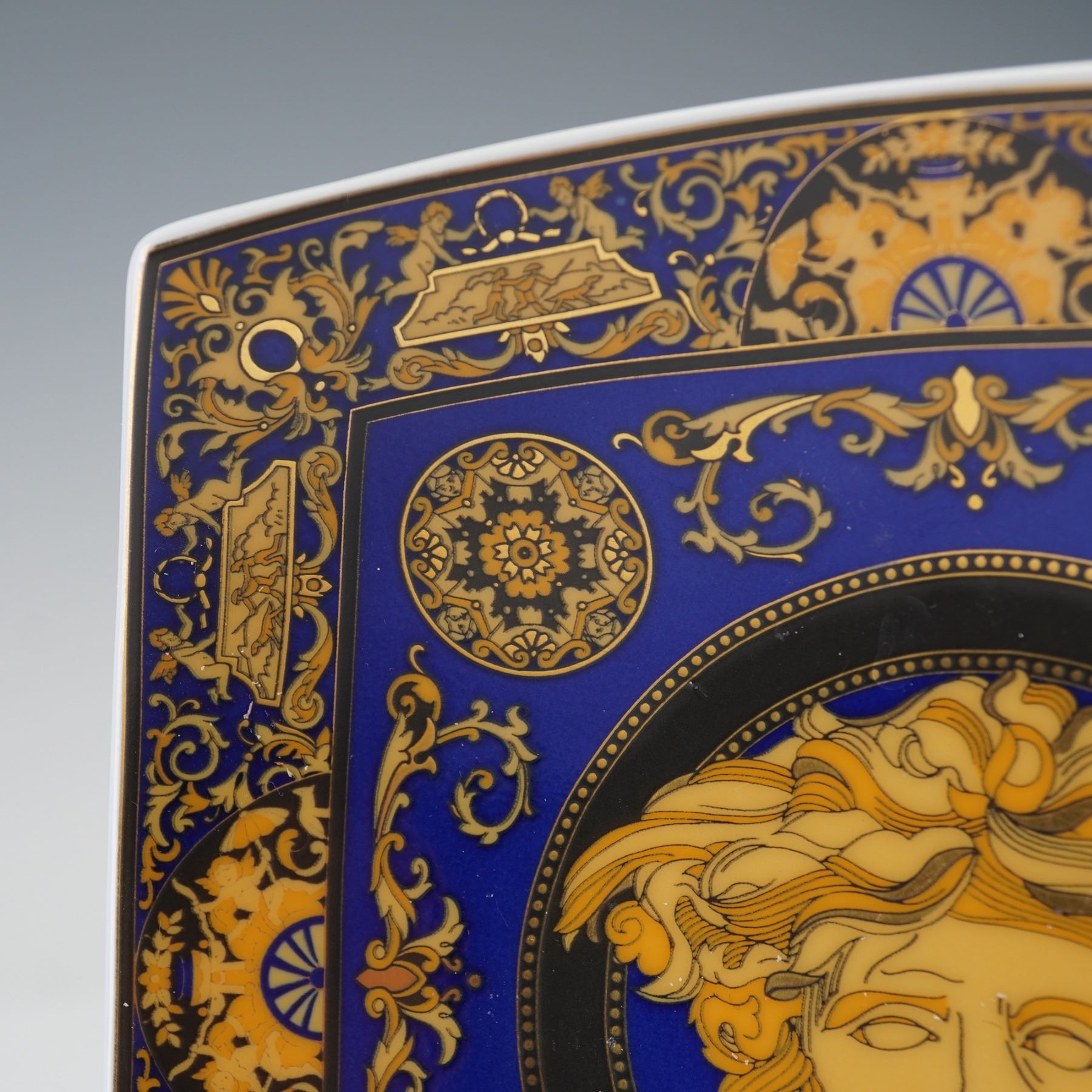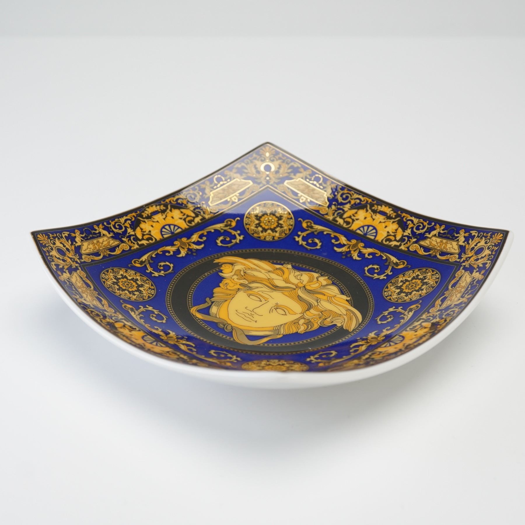 A fine porcelain dish designed by Versace for Rosenthal, part of the prestigious Medusa Blue collection. This square-form dish showcases the iconic Medusa head at the center surrounded by intricate gilt scrollwork and classical motifs in rich cobalt blue and 24K gold. The opulent design reflects the collaboration between Rosenthal's master porcelain craftsmanship and Versace's signature Baroque aesthetic. Marked on the underside with the Rosenthal Versace Medusa Blue hallmark and original label.