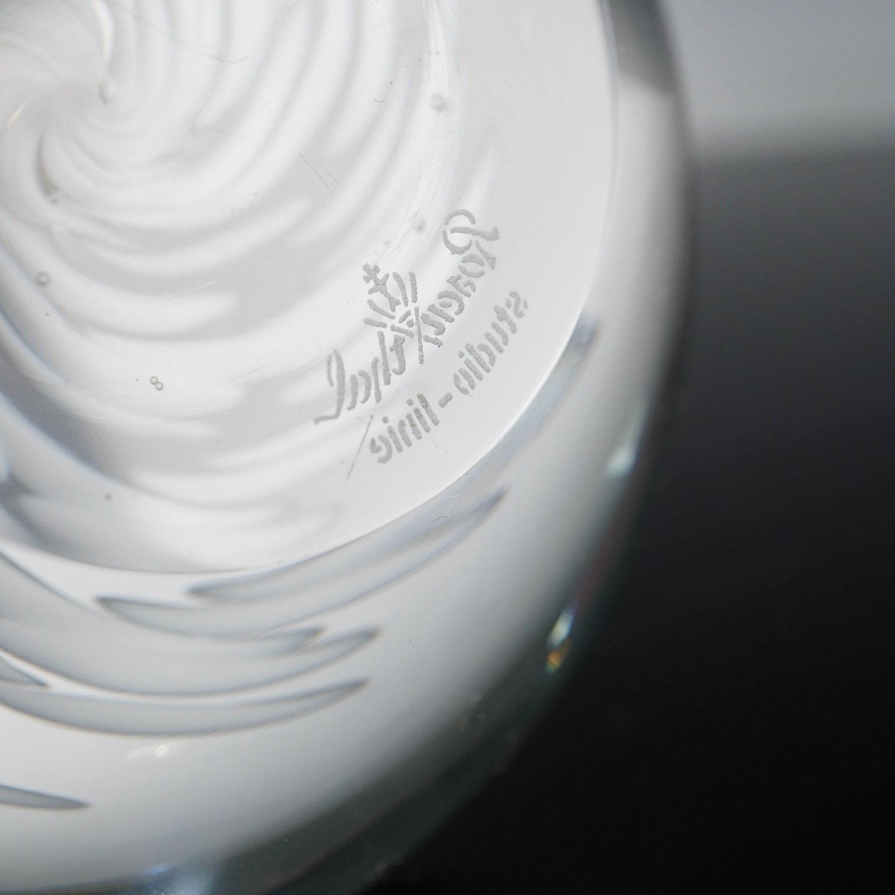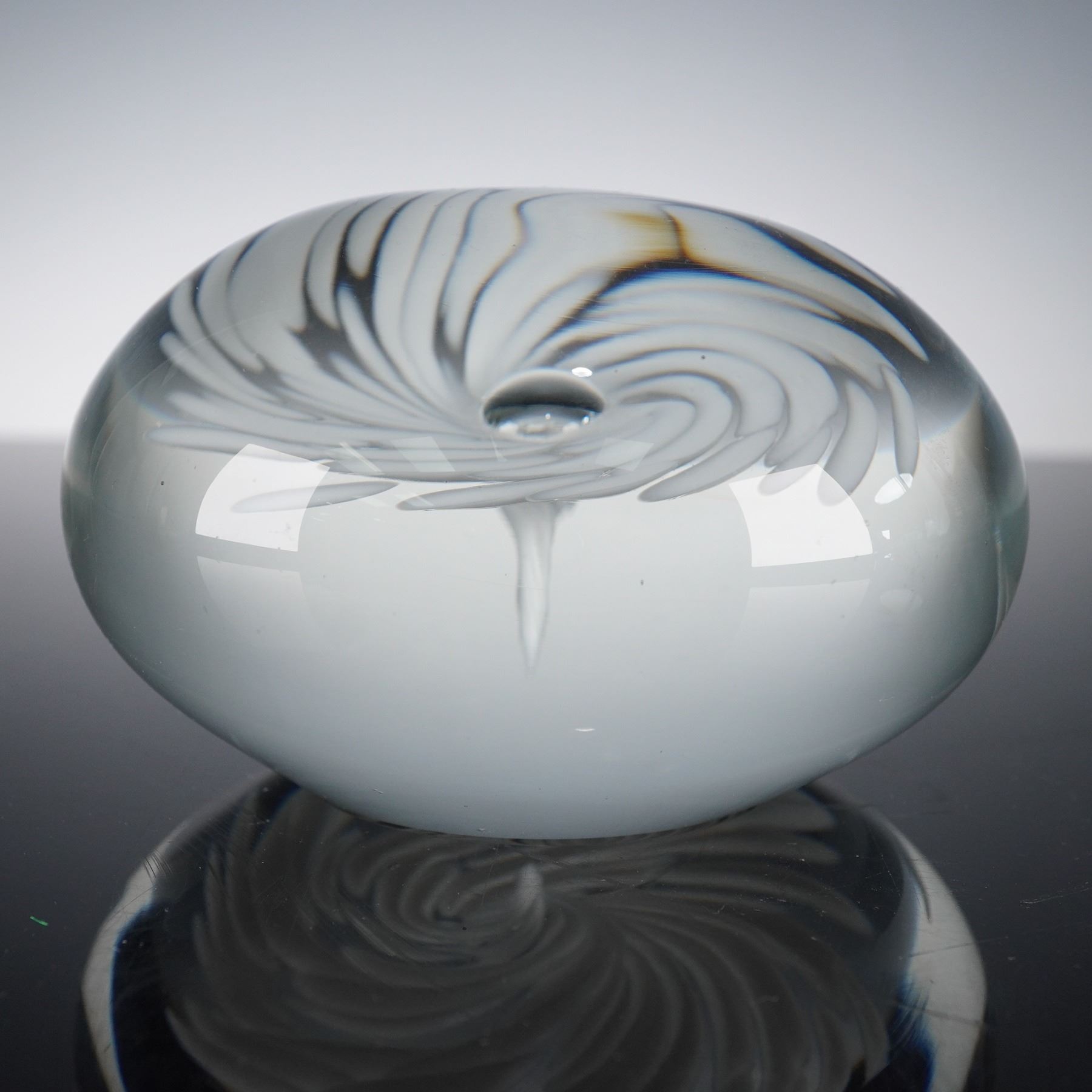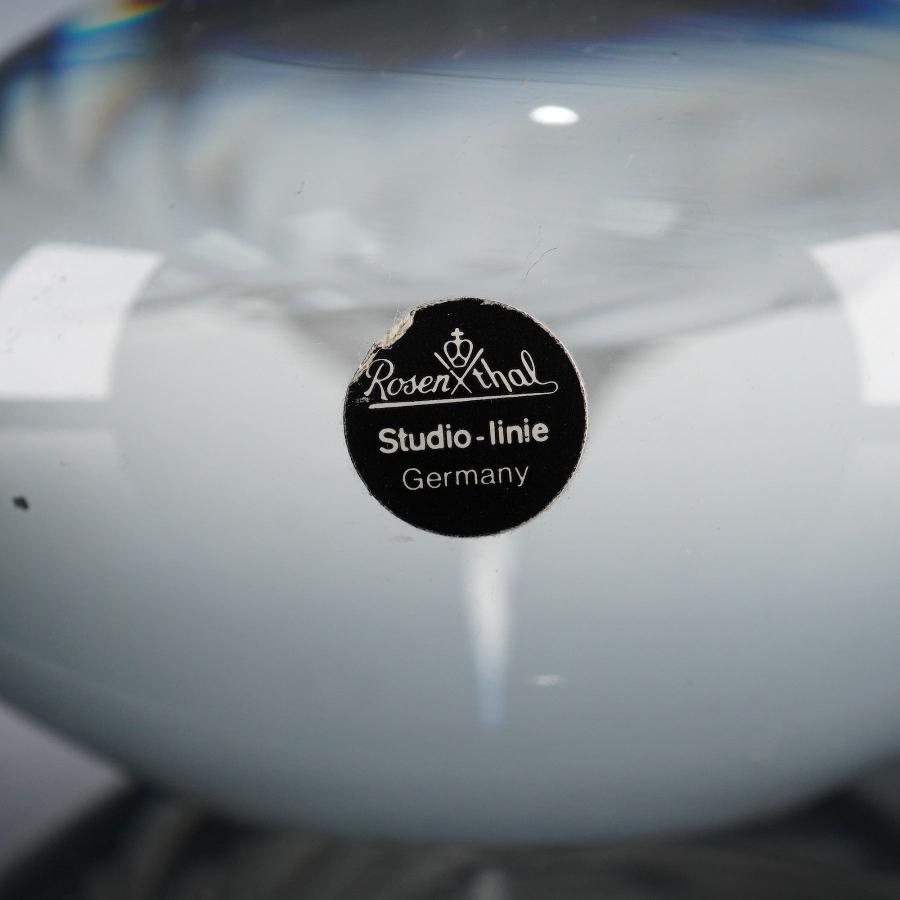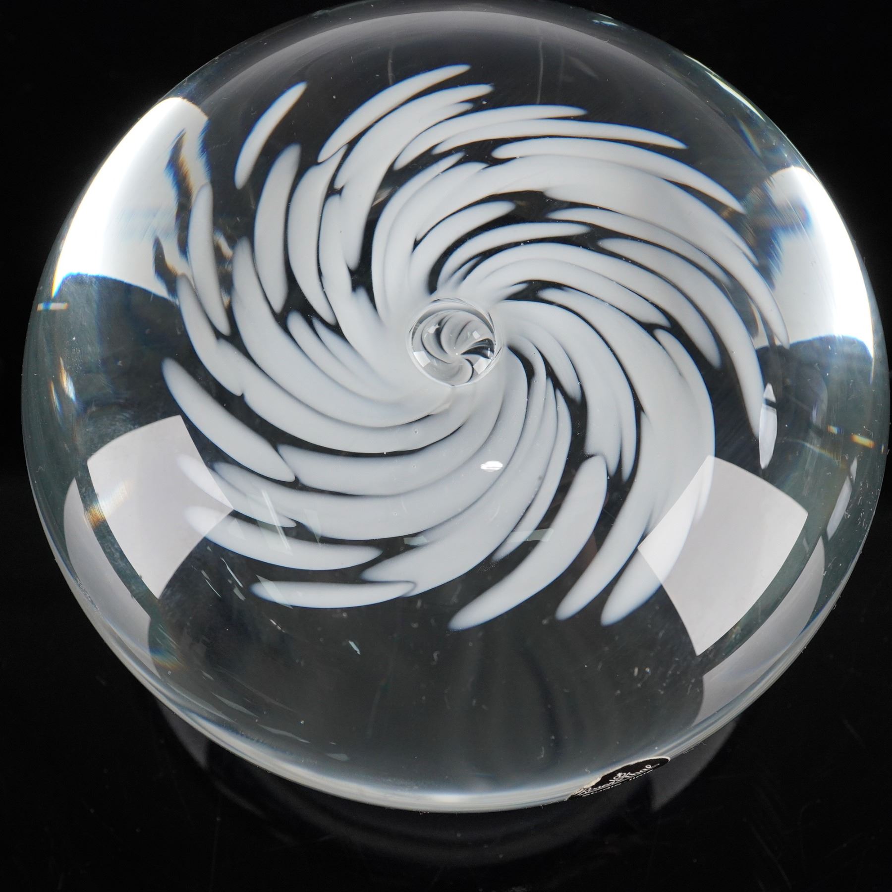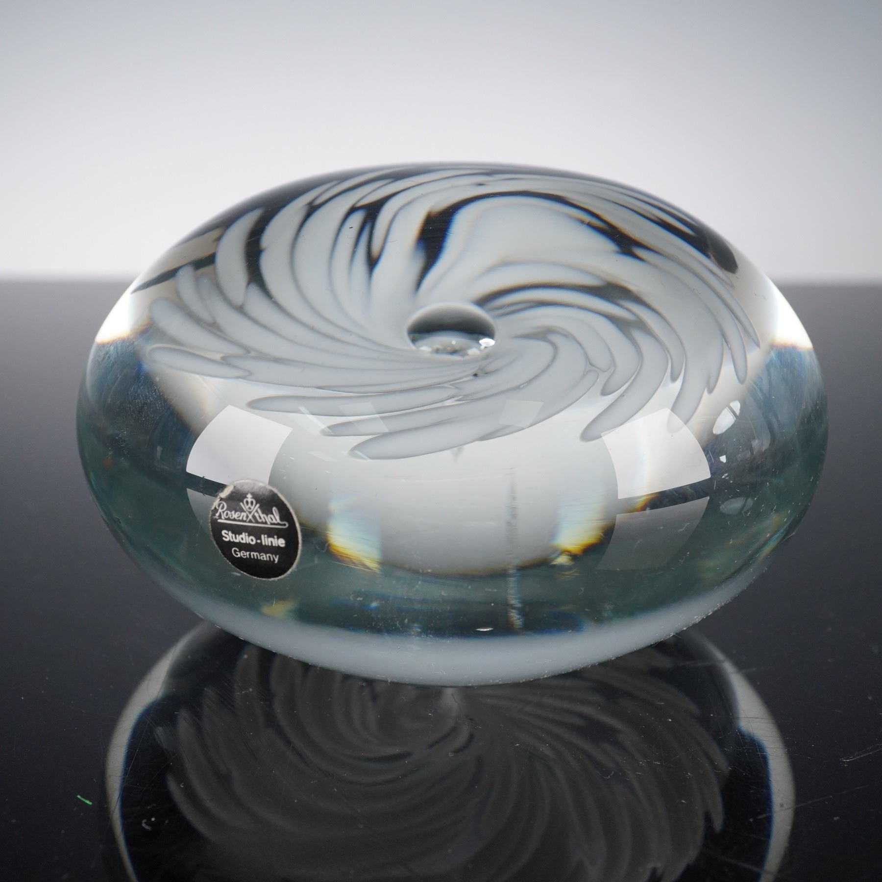 A striking mid-century modern glass magnum paperweight by Rosenthal Studio-Line, Germany. This substantial piece features a mesmerizing internal swirl of white tendrils suspended within clear crystal, creating a dynamic vortex-like effect when viewed from above. The heavy, domed form has a smooth polished surface and slightly concave base, engraved with the Rosenthal Studio-Line mark and retaining its original black Rosenthal Studio-line Germany label.