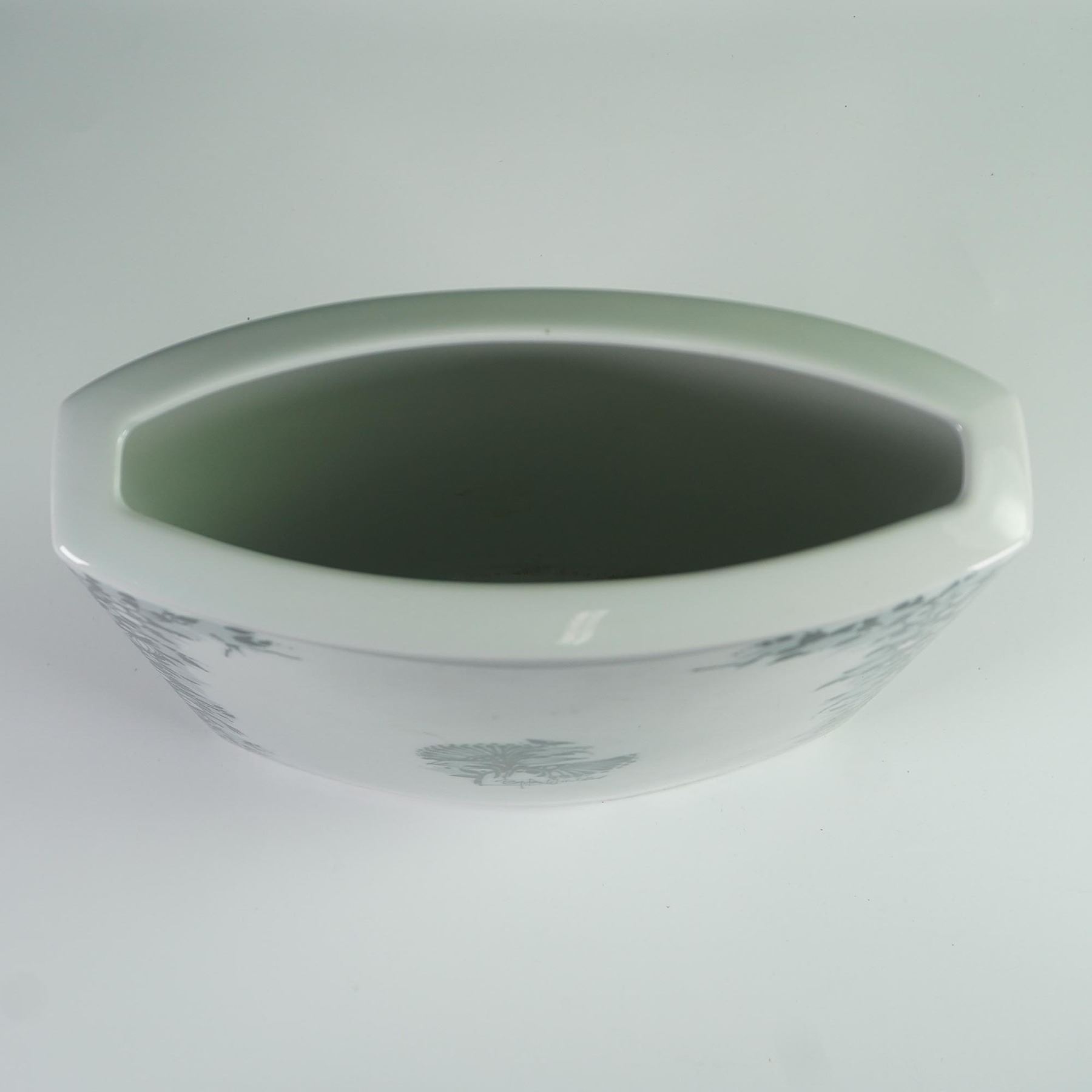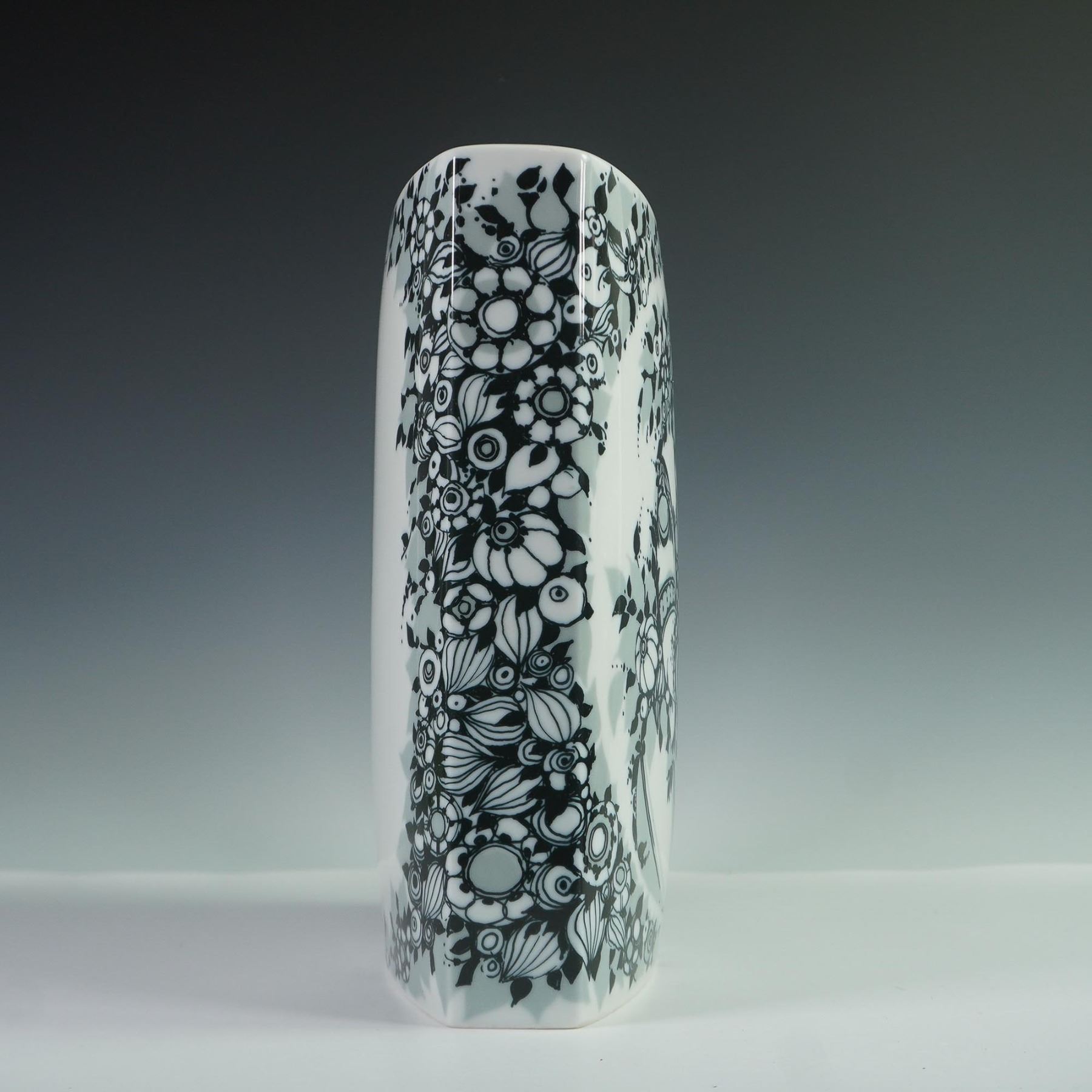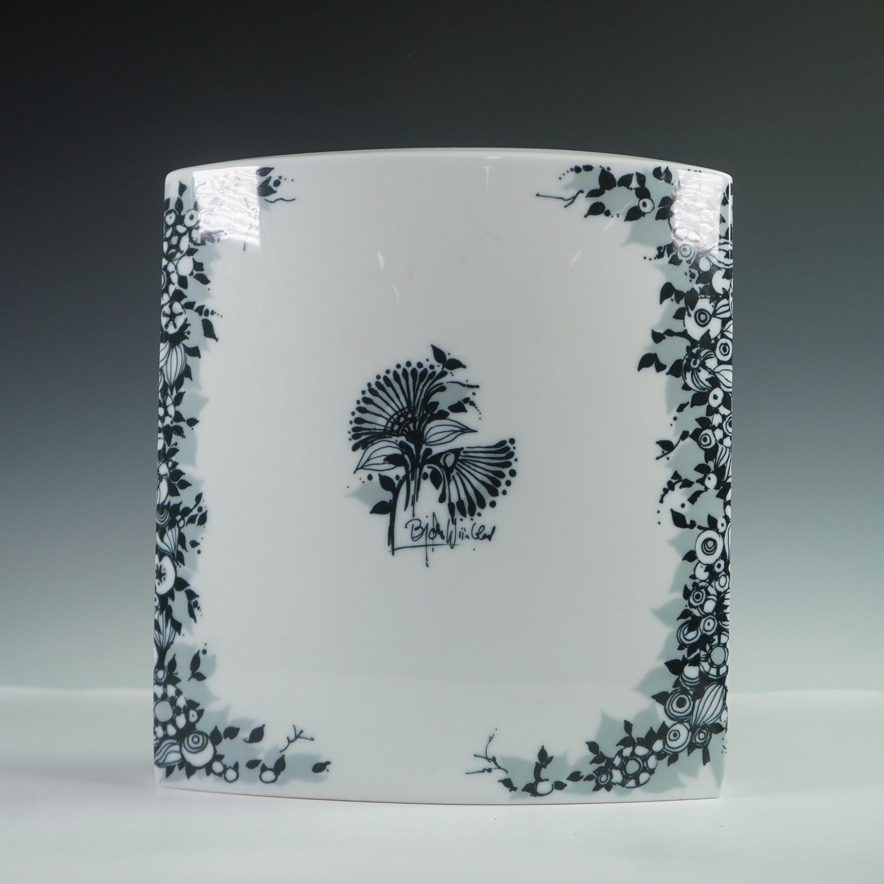 A Rosenthal Studio Line vase from Germany, designed by Danish artist Bjørn Wiinblad. This cylindrical white piece features Wiinblad’s signature whimsical floral and botanical motifs in black, wrapping around the form with intricate linework. Signed within the design and marked on the base with the Rosenthal Studio Line backstamp and Wiinblad’s name.