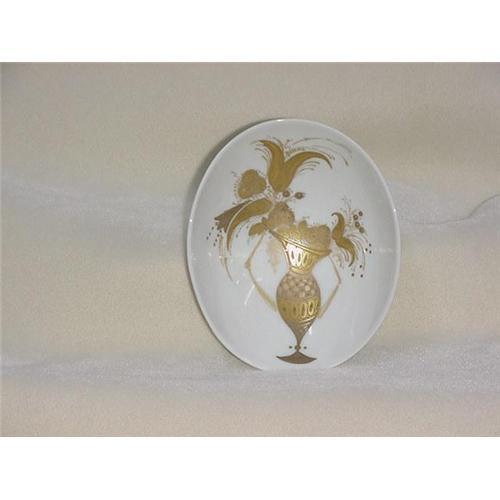 Artist signed oval bowl 6 1/4'' long by 5 1/4'' wide by 2 1/2'' deep. Painted with a gold vase and flowers. Artist signed on reverse as shown in photo.