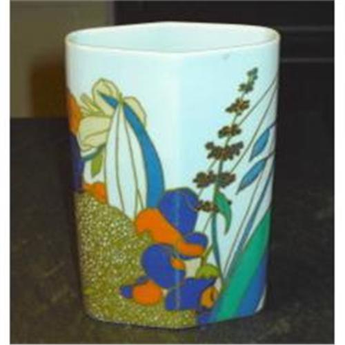 This is a highly desirable Rosenthal Vase from the Studio Linie design of brightly colored floral design outlined in gold against a white background, #2786/18 signed, marked, 7" height.
