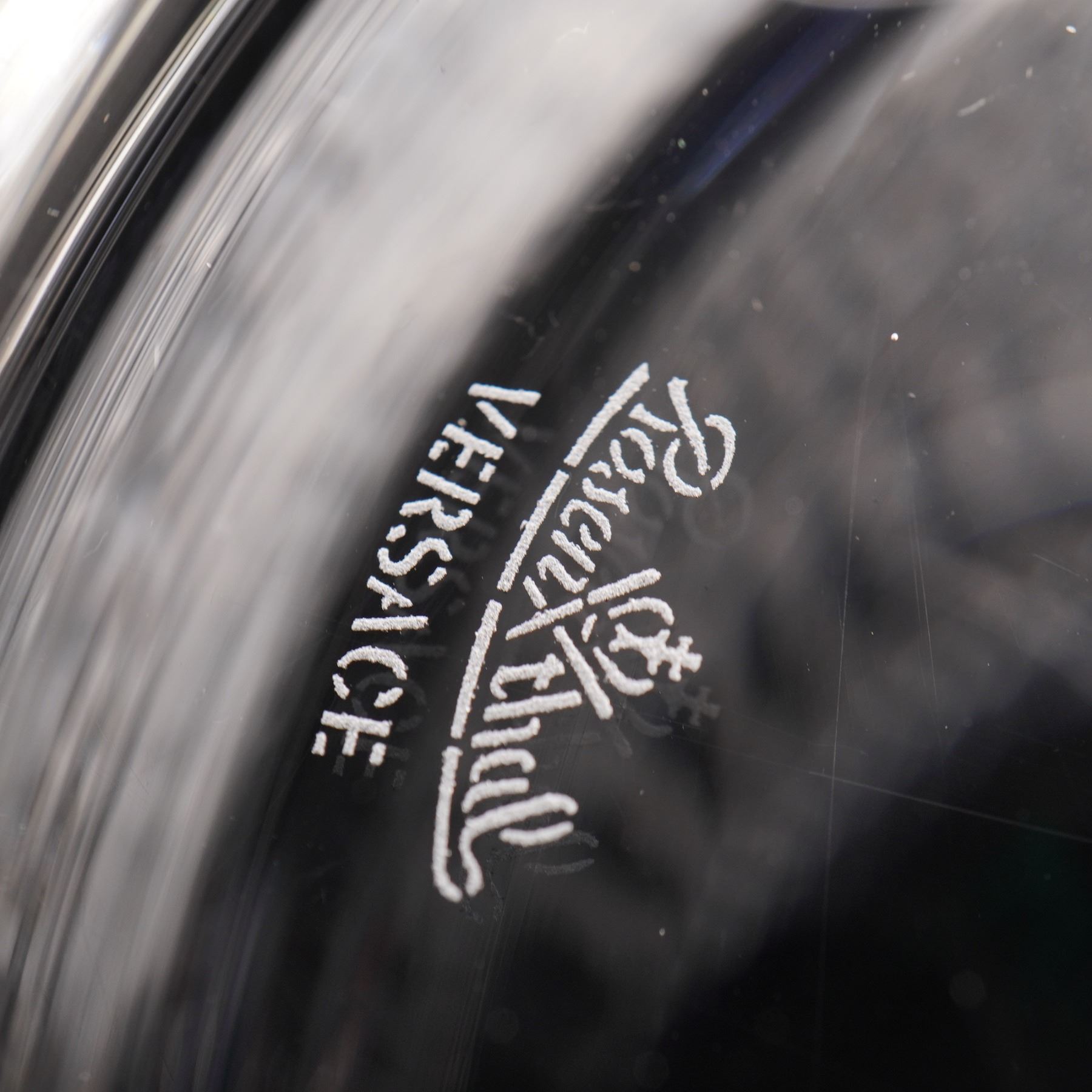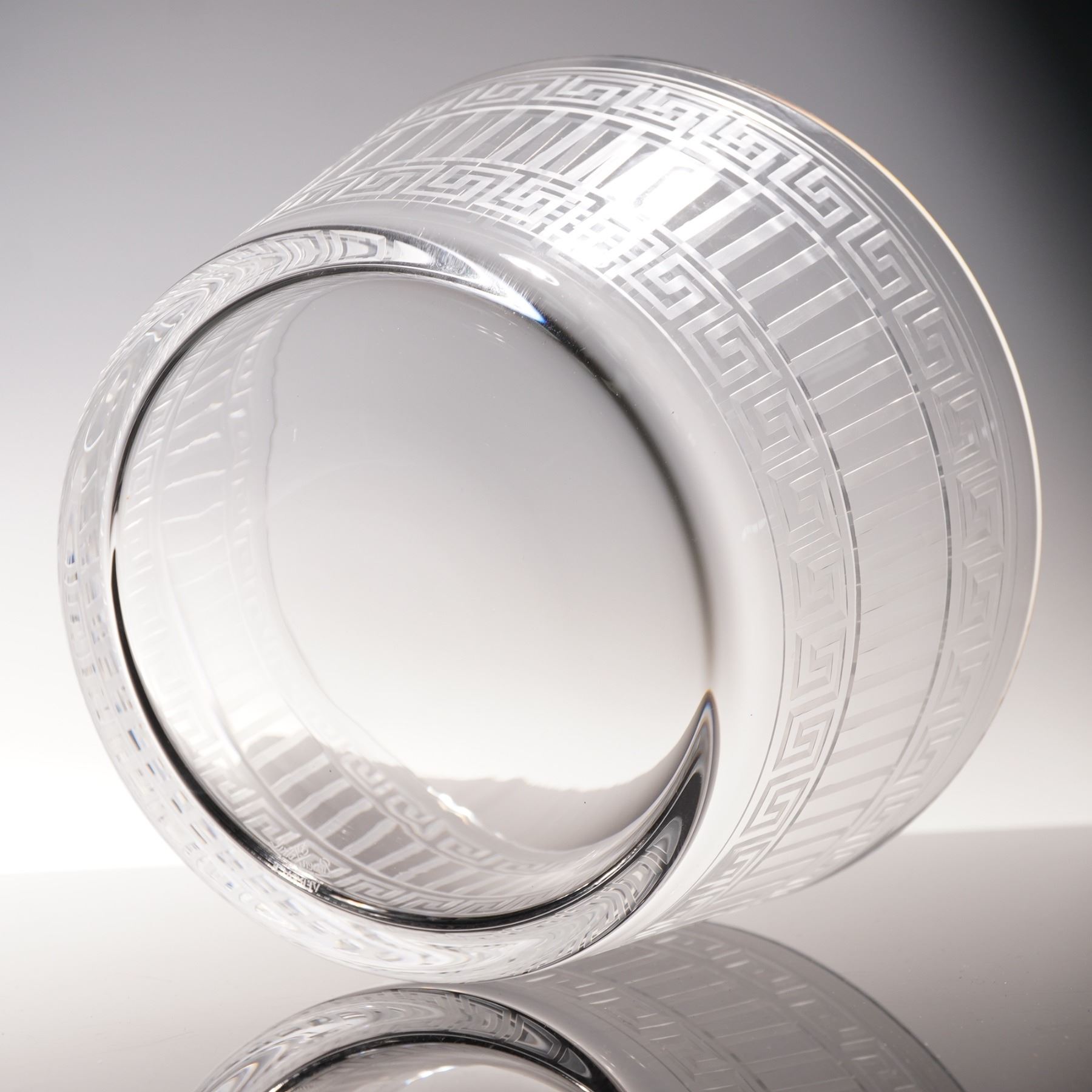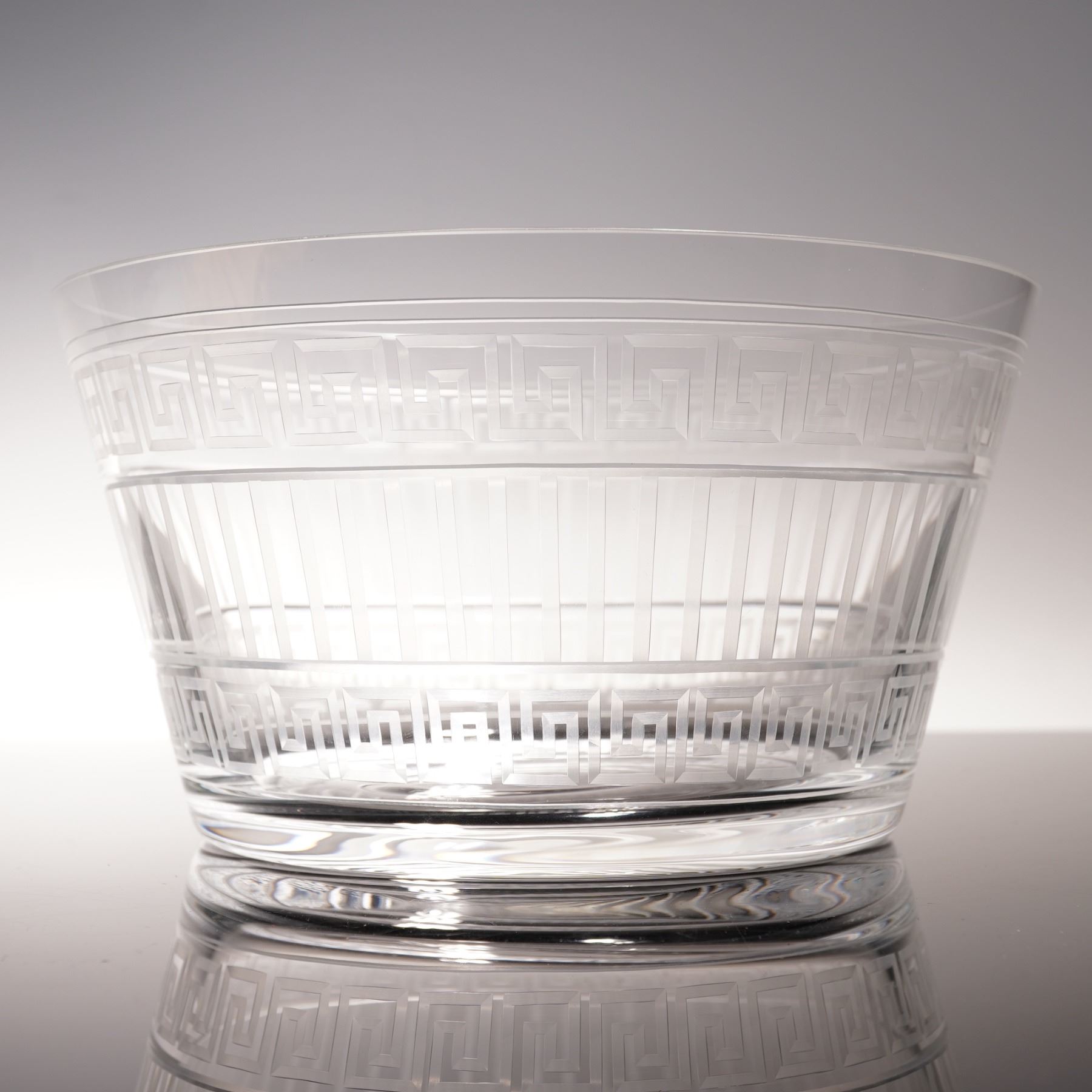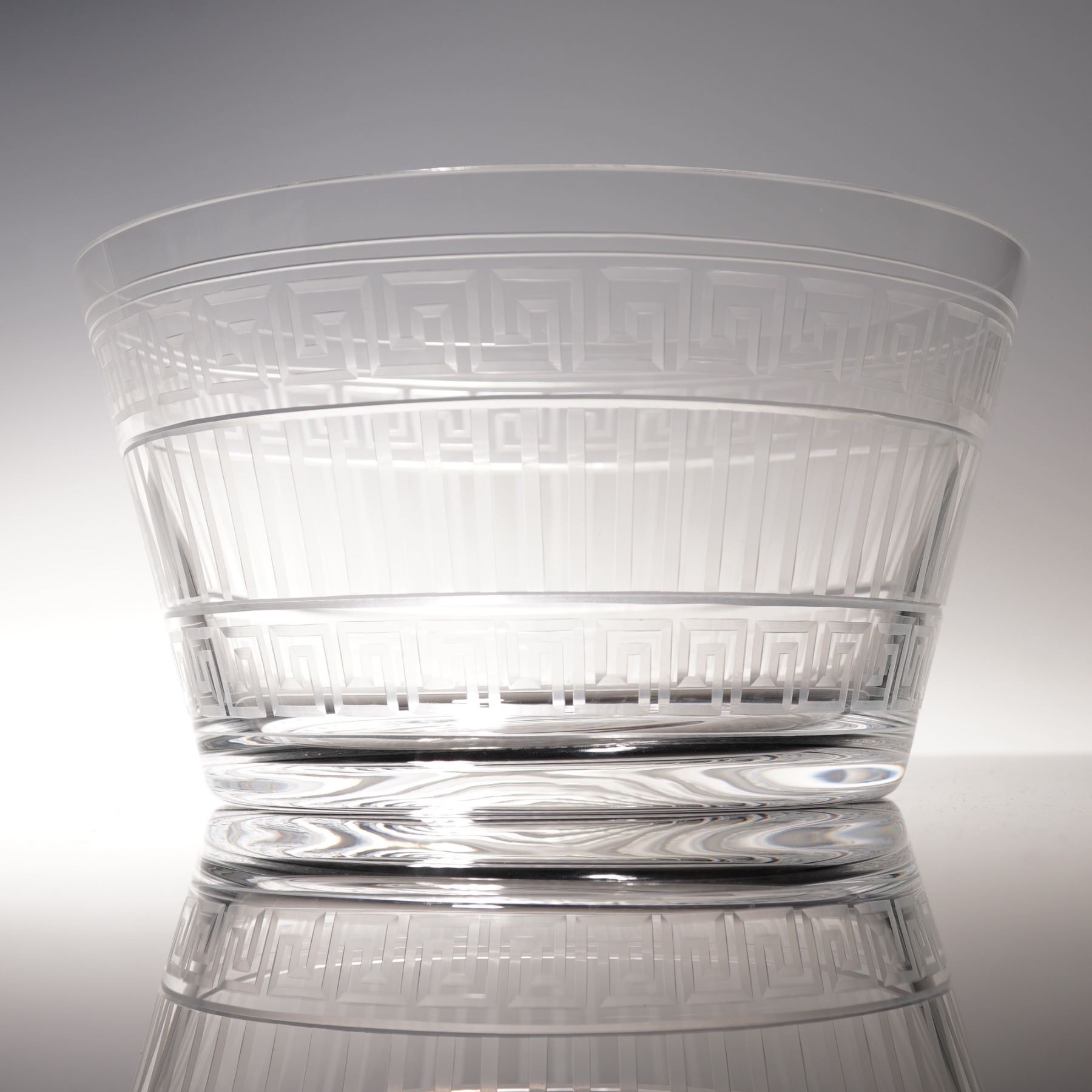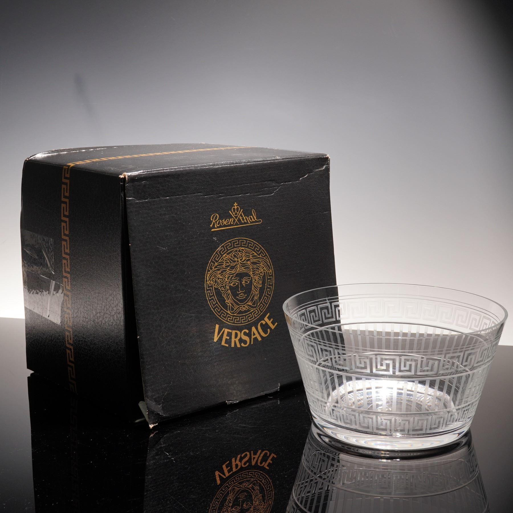 A Rosenthal Versace crystal bowl from the Meandre collection, finely crafted with etched Greek key and linear motifs. This striking design reflects the luxury and refinement of the Versace aesthetic, produced in collaboration with the renowned German porcelain and crystal maker Rosenthal. Retains original box and etched Rosenthal Versace mark to base.