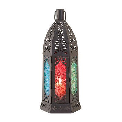 Rosette Prism Candle Lantern **|**|** Vibrant colors dance when a candle is lit inside this handsome tabletop candle lantern. Rich, jewel-tone hues come to life with the brightly colored and patterned glass panels framed by the intricate design of the dark metal lantern frame. Brighten your home with exotic flair! Item weight: 0.8 lb. 4 x 3-3/4" x 10" high. Iron and glass. 1 EA"