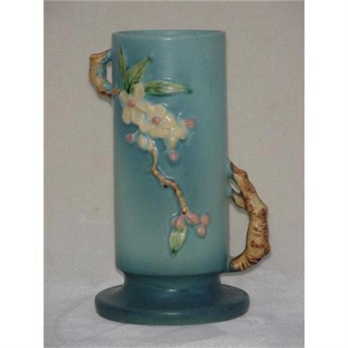 Roseville's 1948 line titled "Apple Blossom", #387-9'' blue vase. Beautiful blue background with delicate white apple blossoms. Crazing and age crack as shown in photo, sold as is.