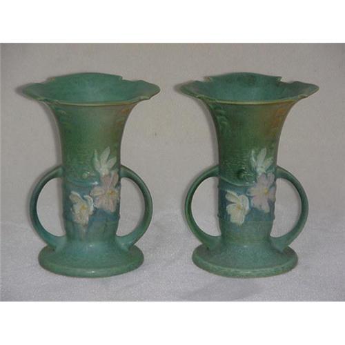 Roseville's 1940 line titled "Cosmos", a pair of #947-6'' vases. Green with white and pink cosmos flowers. One with chip on rim as shown. Priced as a pair.
