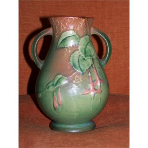 Amazingly beautiful. A special piece for Roseville collectors. This mint condition vase is in the sought-after fuschia pattern. Also see matching bowl from same dealer. The Kahns have been collecting fine pottery for over 30 years.
