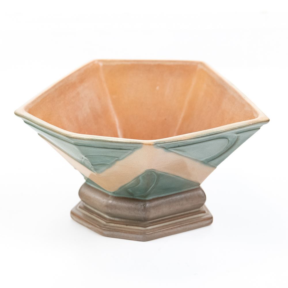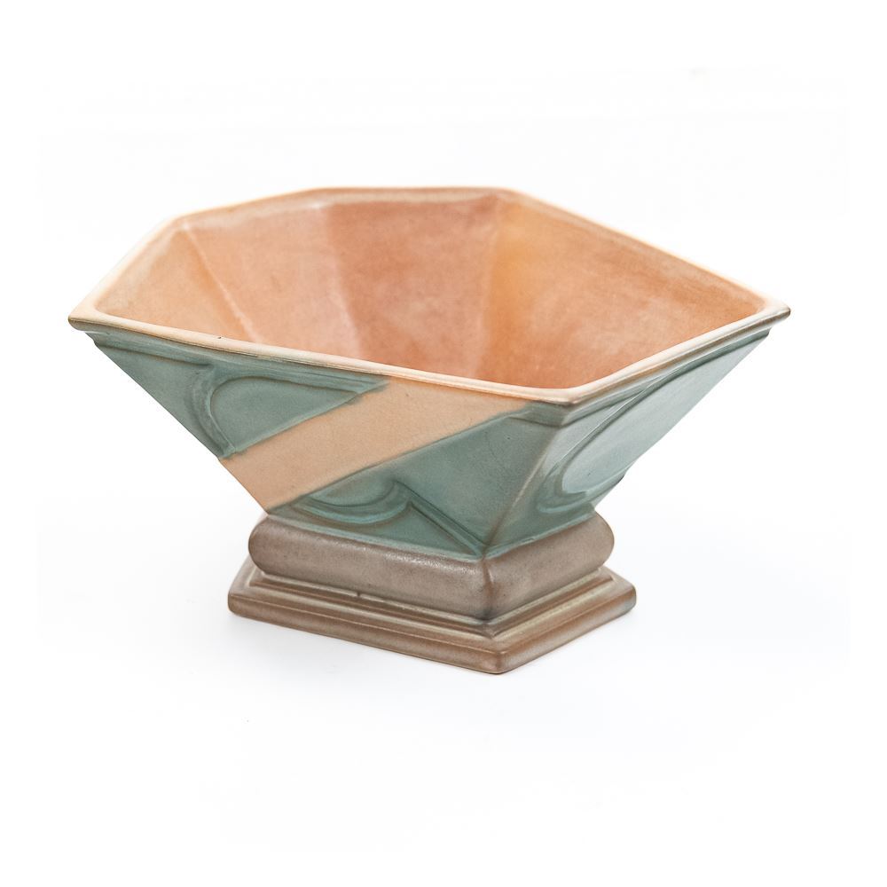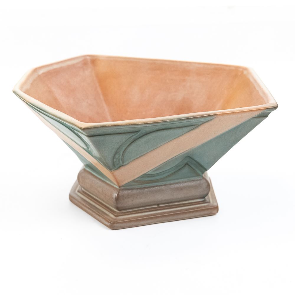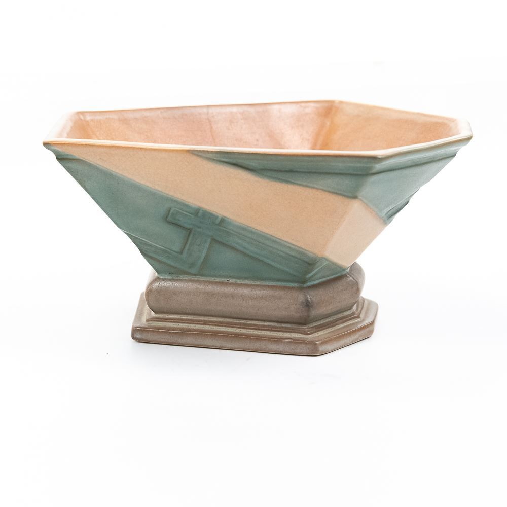 Roseville Futera Aztec bowl planter 4"t x 7.5"d x 8.5"l ; good to very good overall condition with minor cosmetic imperfections such as minor discoloration & crazing. Perfect addition to your collection, please use photos to judge condition and bid accordingly.