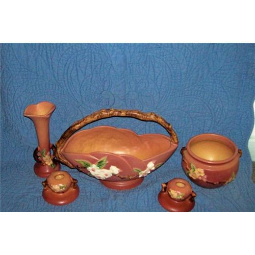 This is a nice collection of Roseville Apple Blossom pieces. They are all excellent to mint. There are no chips, cracks, or repairs.