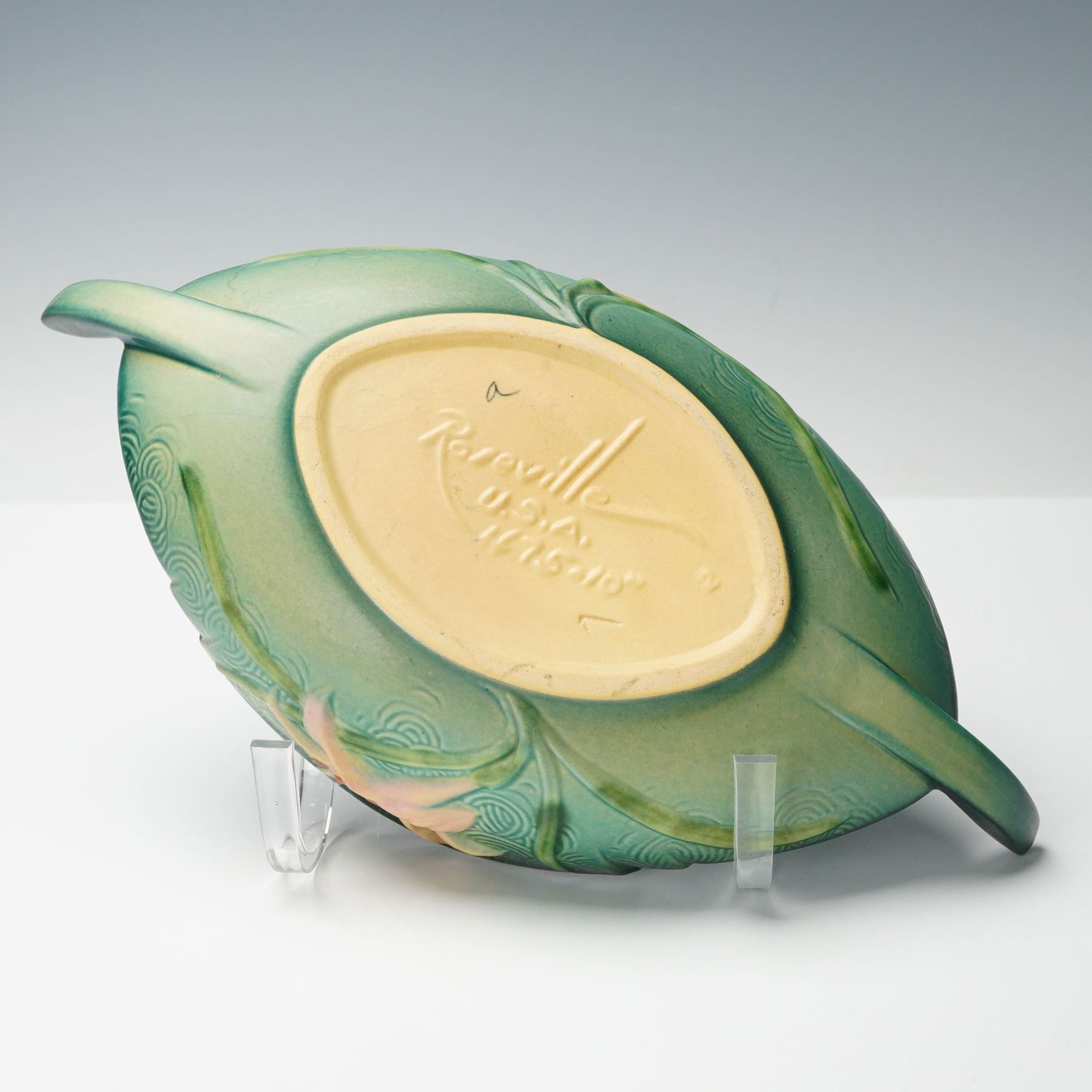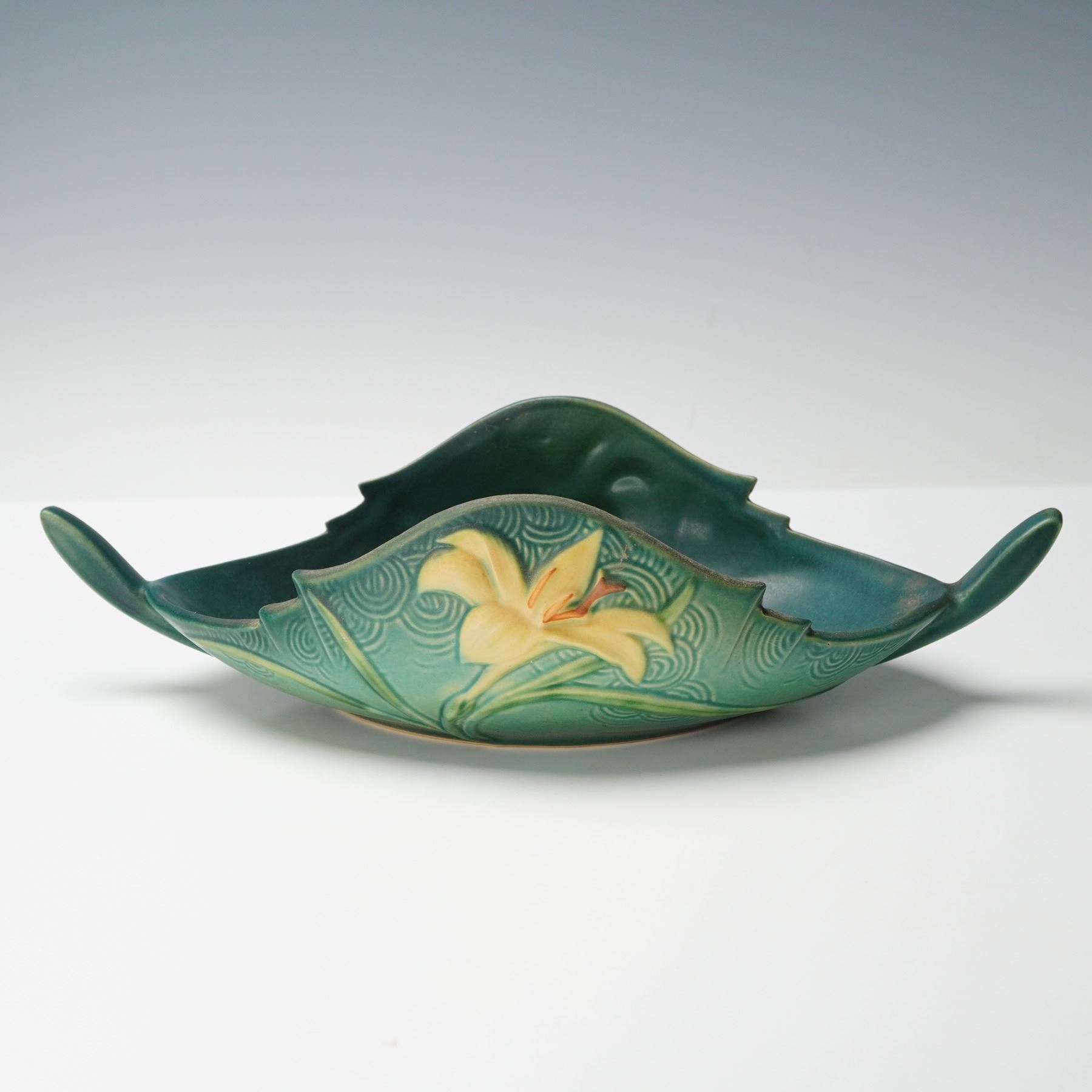 Fashioned in a wide flaring form, this console bowl features molded lily flowers and leaves against a textured green glaze with incised background detail. The design represents Roseville's Zephyr Lily line produced in the mid-20th century. Marked on the underside Roseville U.S.A. Model 475-10.