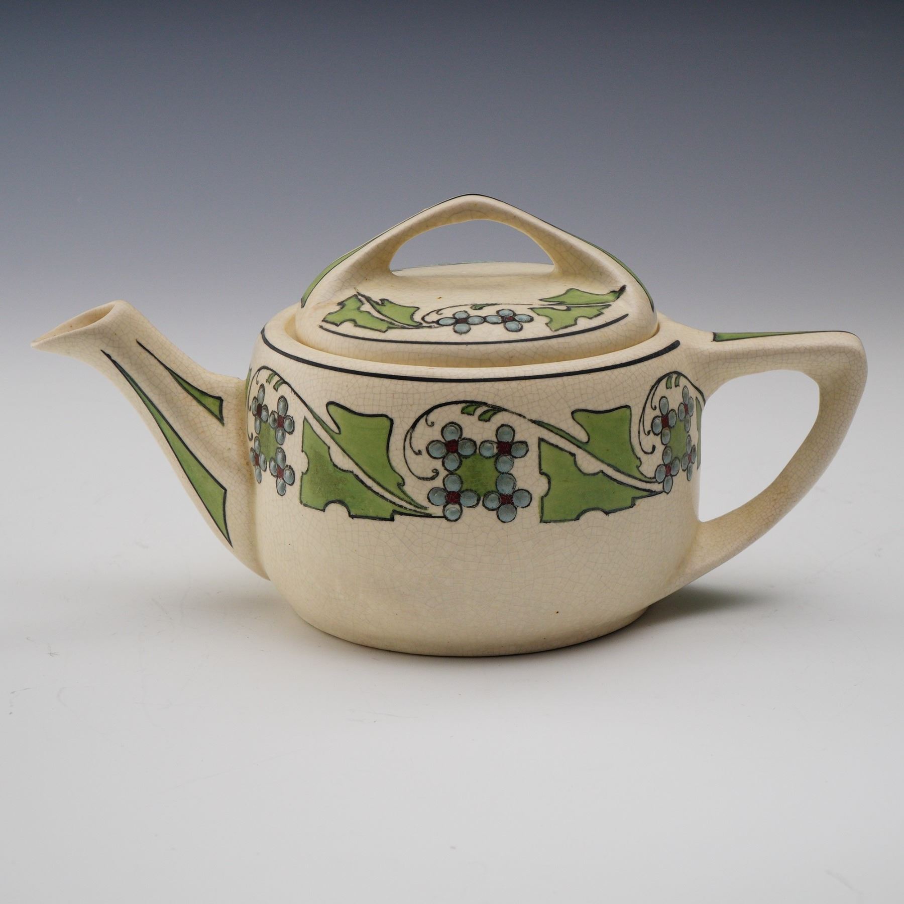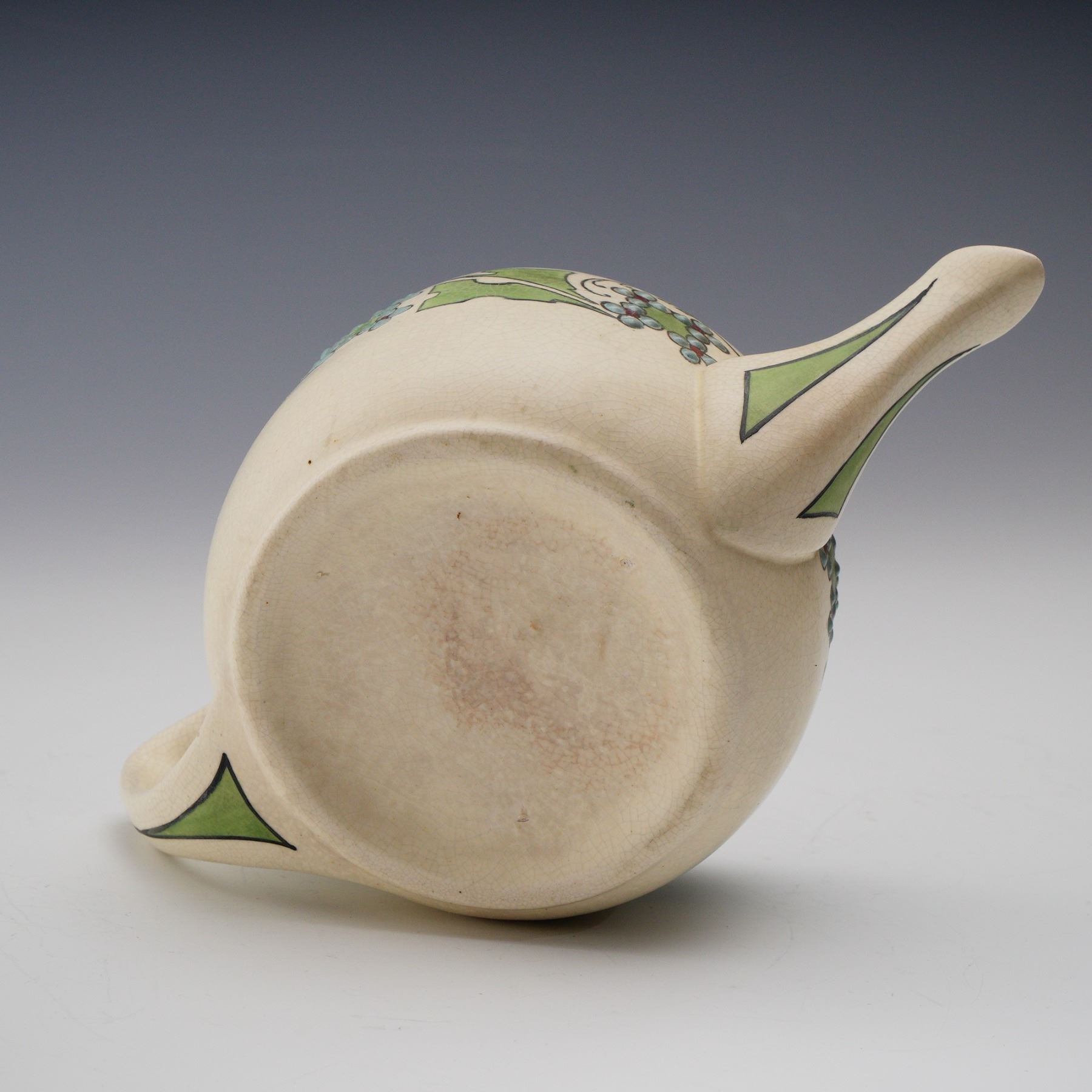 This captivating Roseville Pottery teapot with lid in the Forget Me Not pattern bursts with Art Nouveau energy, its cream ground framed by bold black outlines and sweeping vines that carry clusters of soft blue blossoms and subtle red berries. The elegant triangular lid handle echoes the sculptural spout and handle, creating a graceful silhouette that displays beautifully from every angle. A charming early twentieth century example of American art pottery, this teapot brings the romance of the garden to the table and is a standout addition for Roseville collectors and lovers of decorative arts.