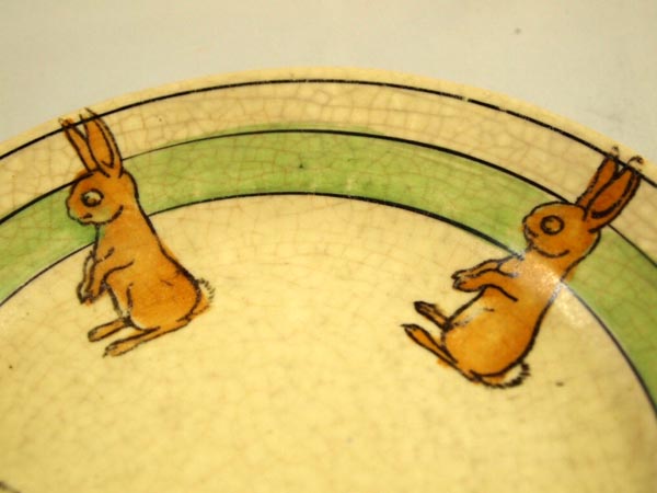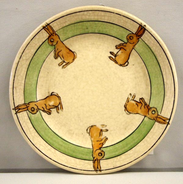 Vintage Roseville Pottery Juvenile Plate, "Rabbit" pattern, 1922-25. Creamware with black edging and light green banding. Slight utensil wear, over-all crazing, faint Roseville "Rv" inkstamp. Measures 7" diameter.