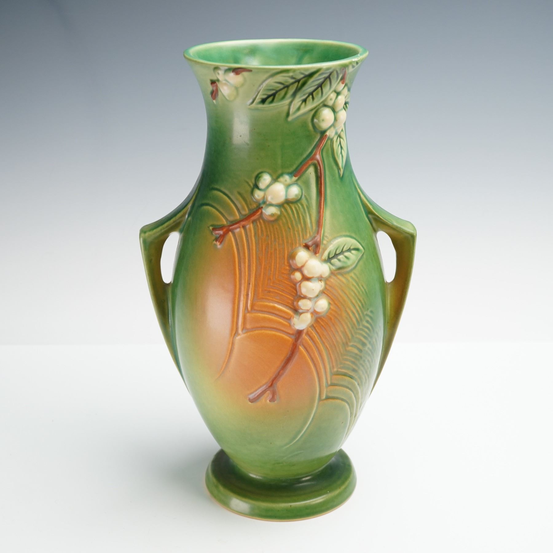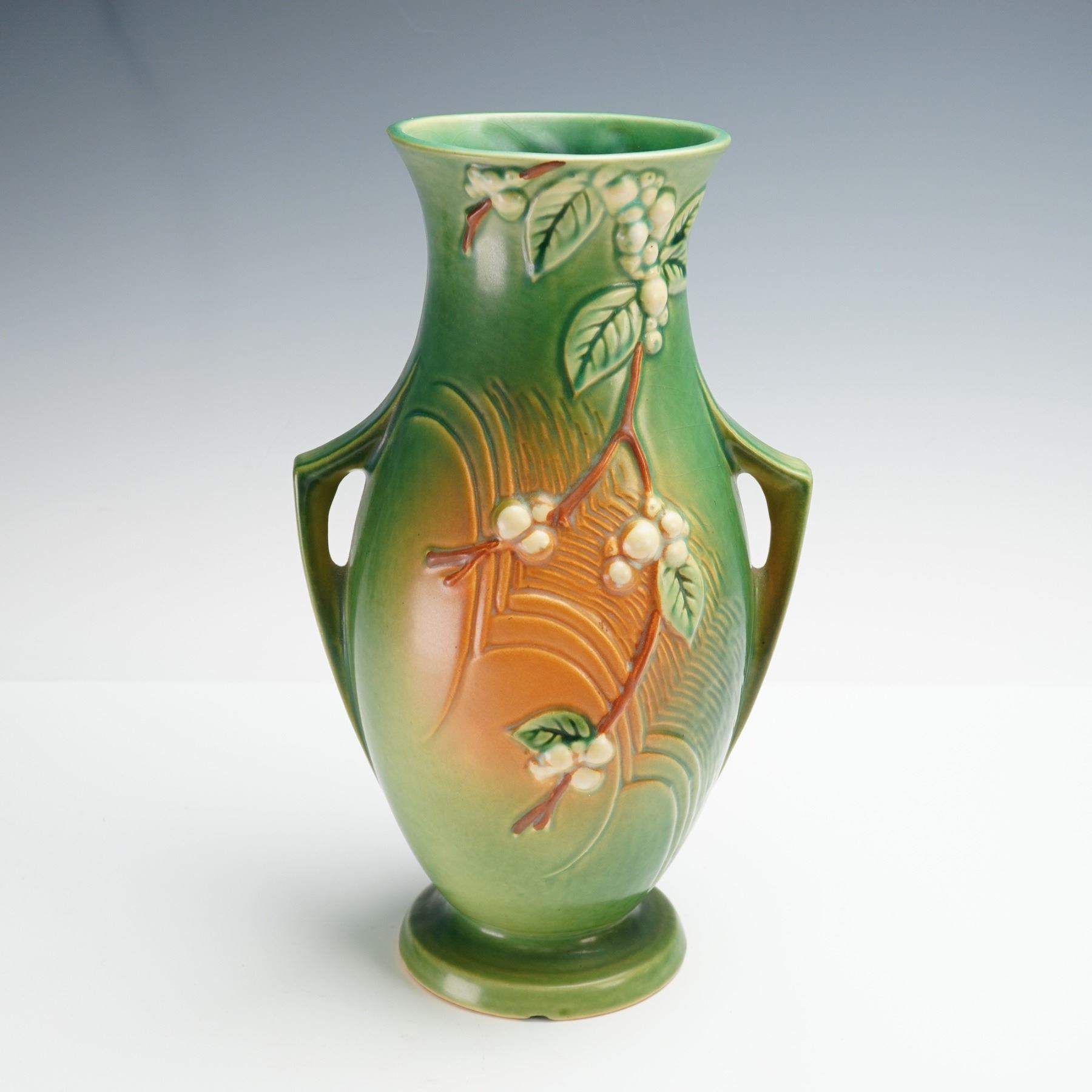 A vintage vase in the Snowberry pattern. This two-handled vase features raised white berry clusters and green leaves on slender brown branches against a softly blended green-to-tan background. Designed in the 1940s, the Snowberry line exemplifies Roseville's mastery of naturalistic relief decoration and rich matte glazes. The flared rim and classic form add elegance to this collectible example of American Art Pottery craftsmanship. Marked Roseville U.S.A. IVI-12 on the base.