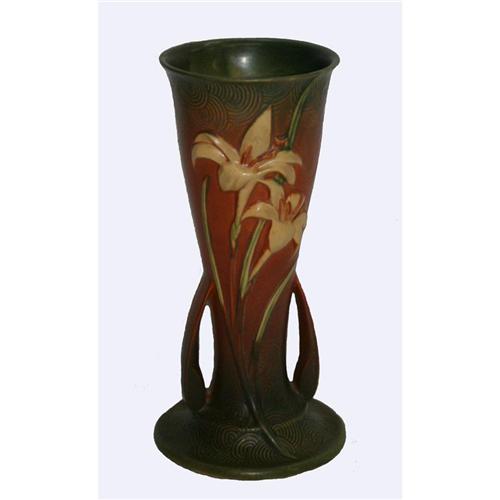 Roseville Pottery Vase in Zephyr Lily Pattern in shades of green, yellow, brown, & orange.  Marked on bottom:  Roseville U.S.A. 139-12".  No chips or cracks.