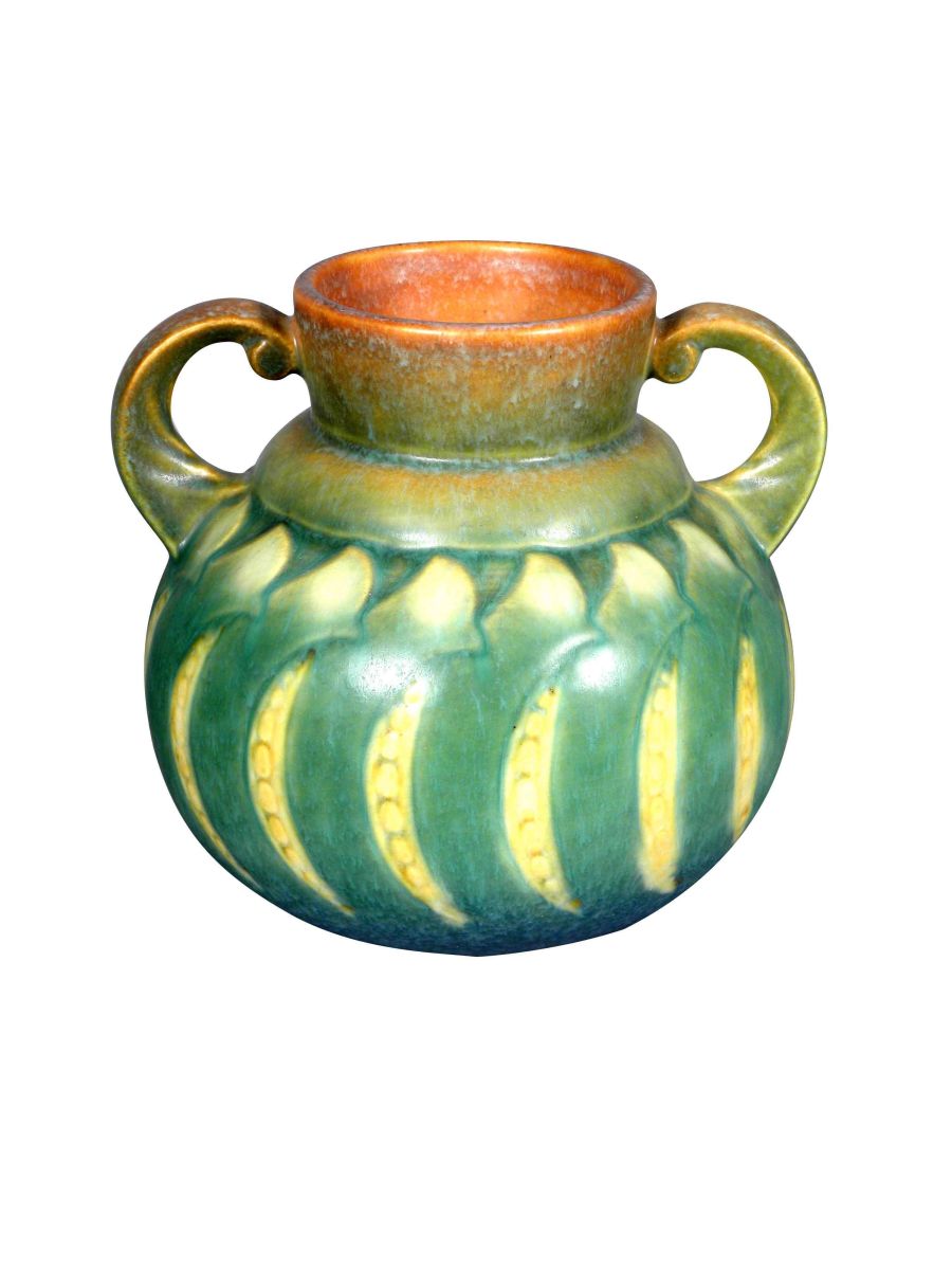Roseville Pottery, two handled vase. Pea Pod Design, paper label. No chips or cracks, excellent condition. 6 1/2 X 6 inches.