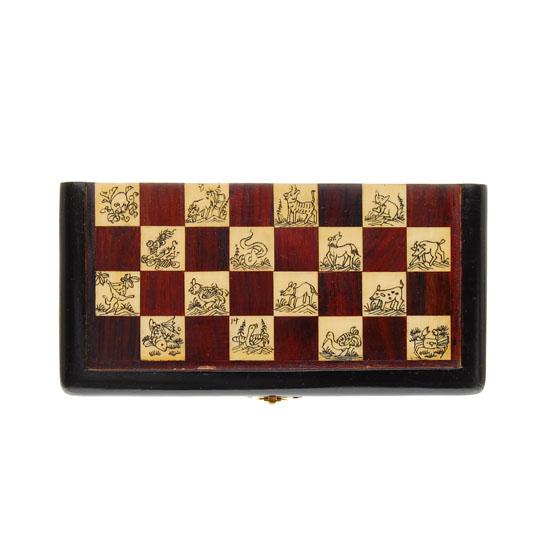 Excellent handcrafted set with handcarved bone playing pieces; Chinese Zodiac Style; 8.5"