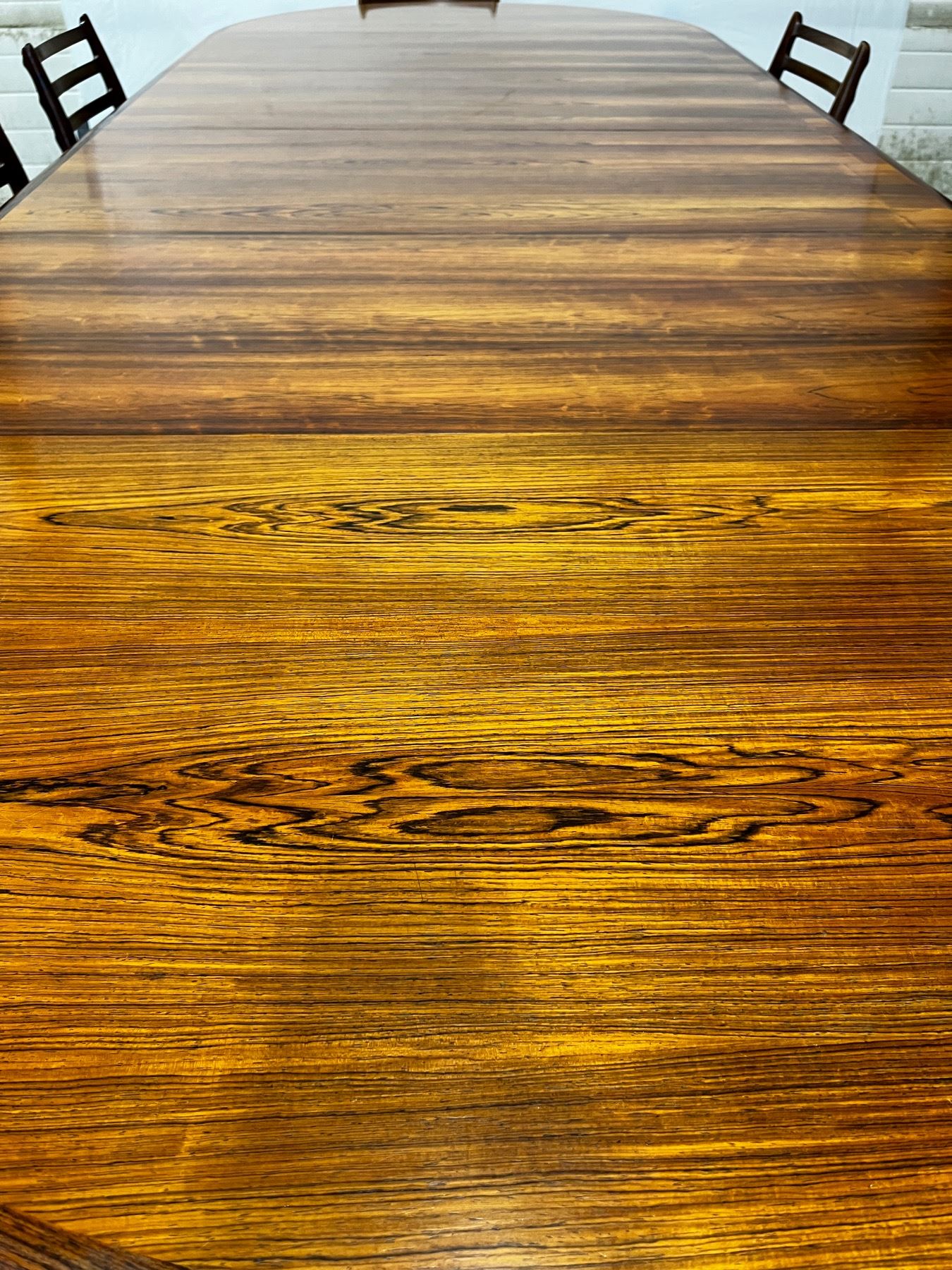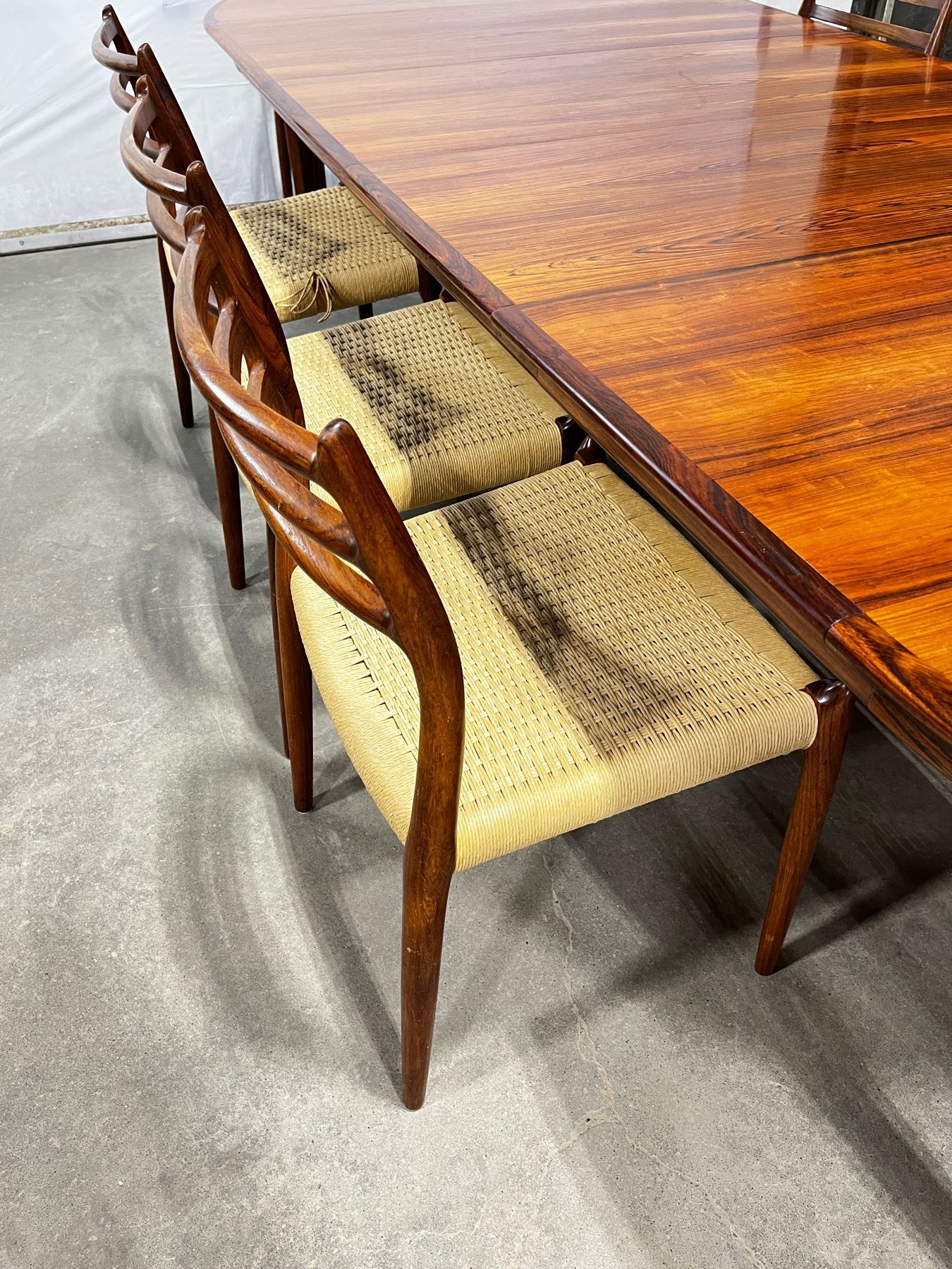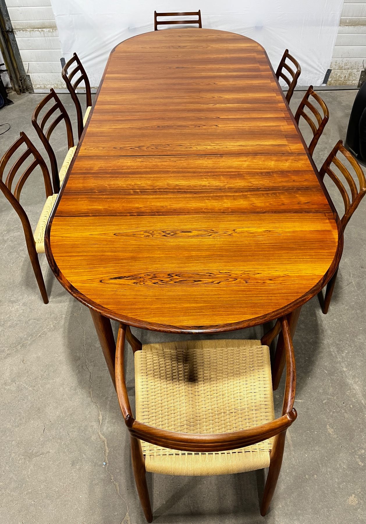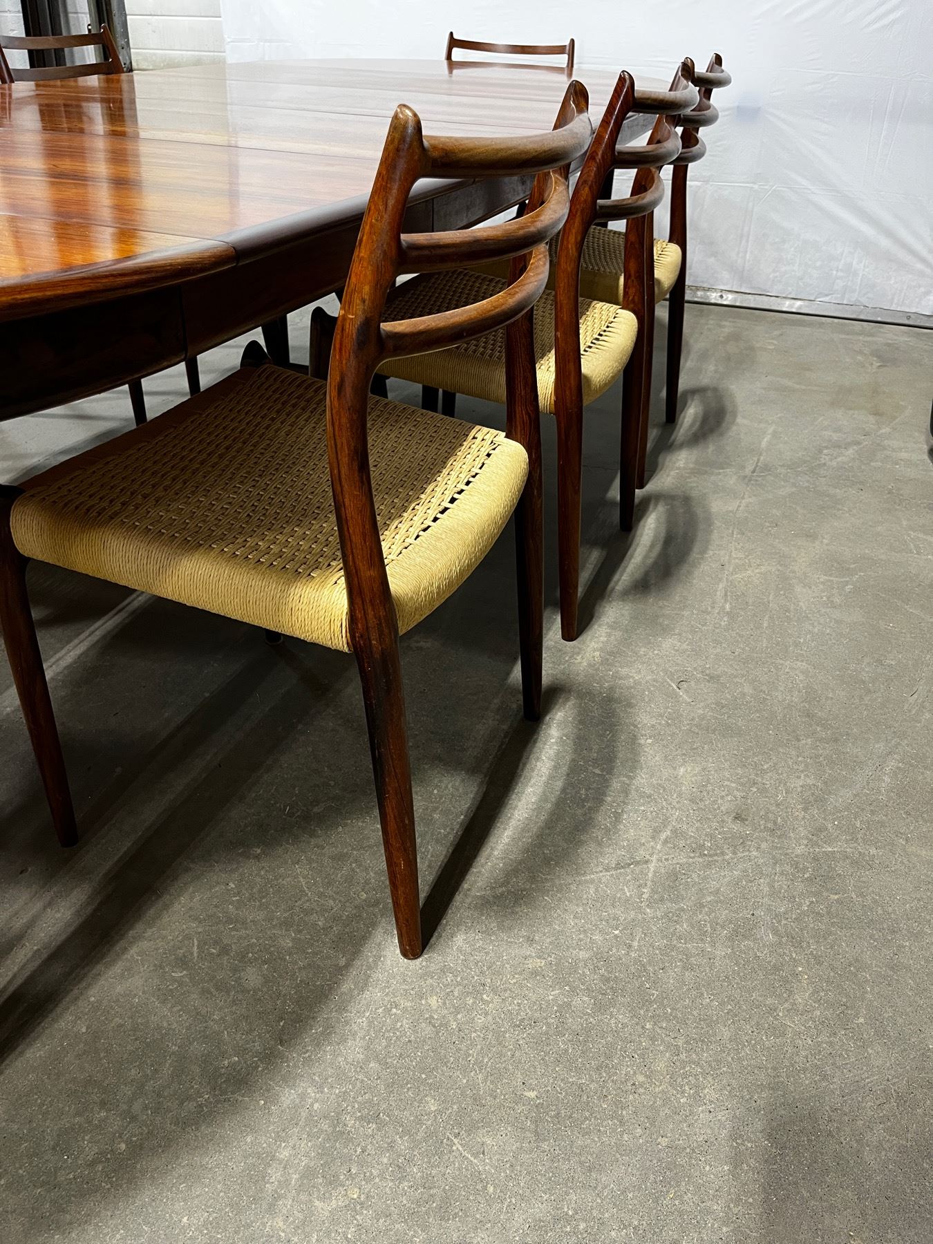 By:Henning Kjaernulf for Soro Stolefabrik. 28.5"H x48.75"Diameter.4x leafs= 19 5/8"wide.Maximum table length3.24M (10FT 7.559") Manufactured 1958-Denmark.With 6 reg. chairs & 2 captain chairs with woven paper cord seats.