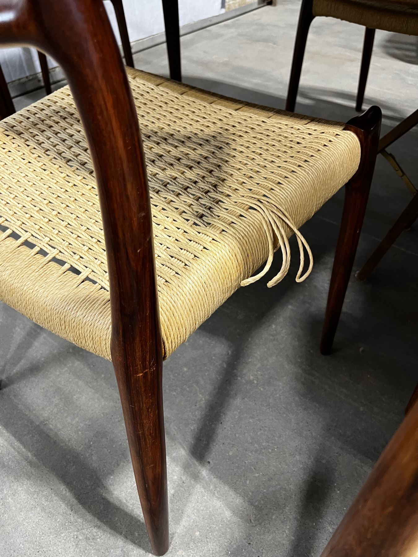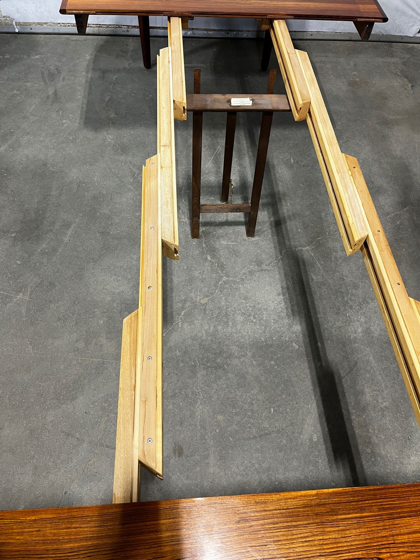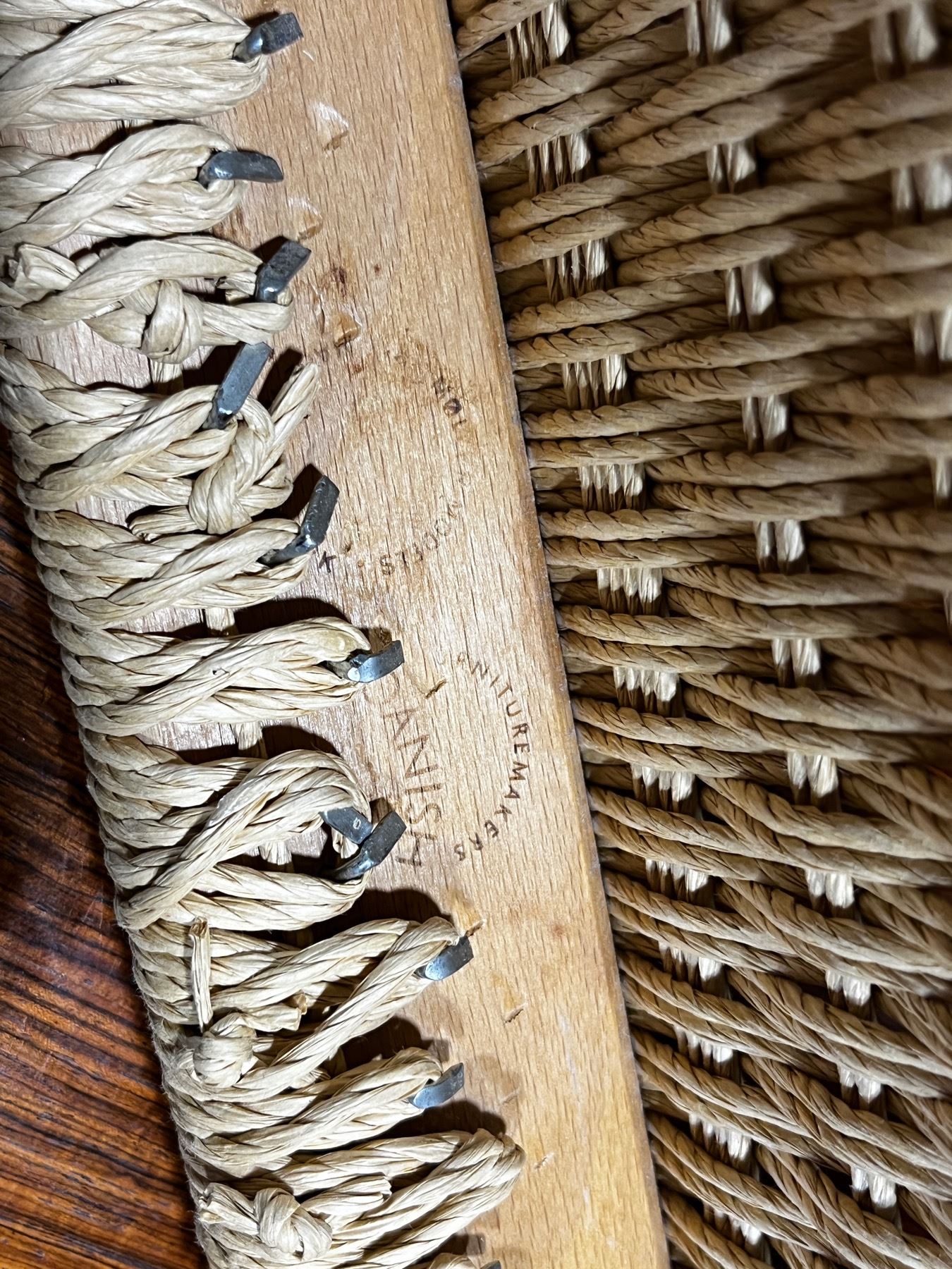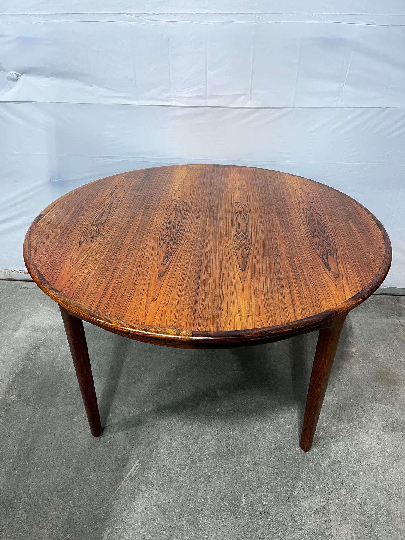 By:Henning Kjaernulf for Soro Stolefabrik. 28.5"H x48.75"Diameter.4x leafs= 19 5/8"wide.Maximum table length3.24M (10FT 7.559") Manufactured 1958-Denmark.With 6 reg. chairs & 2 captain chairs with woven paper cord seats.