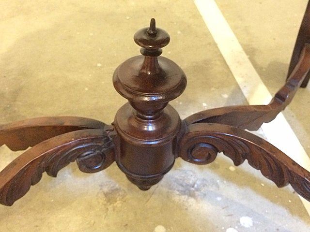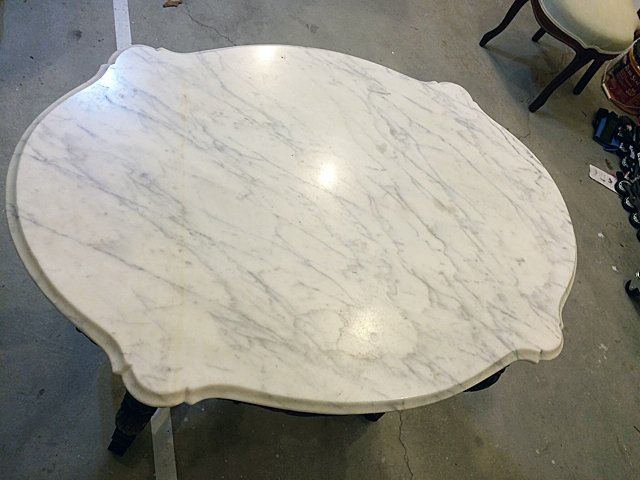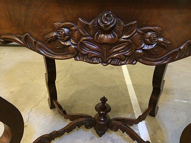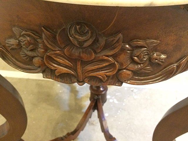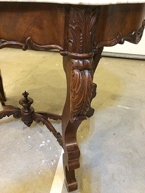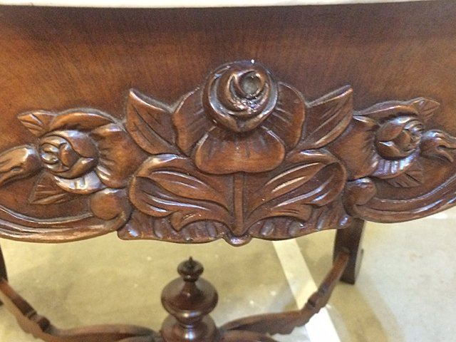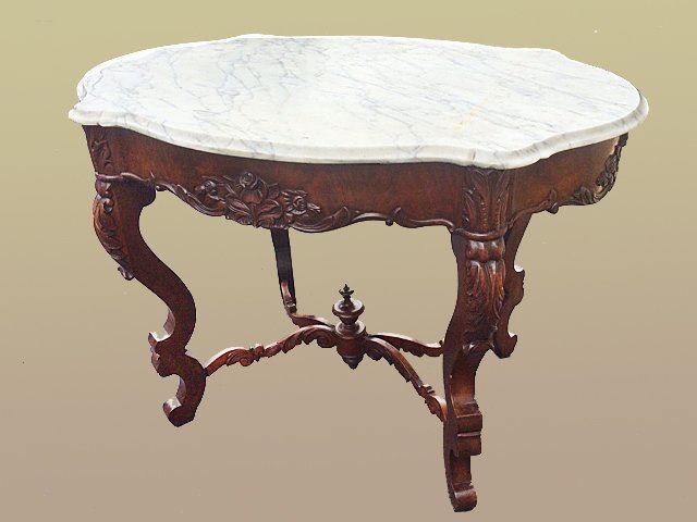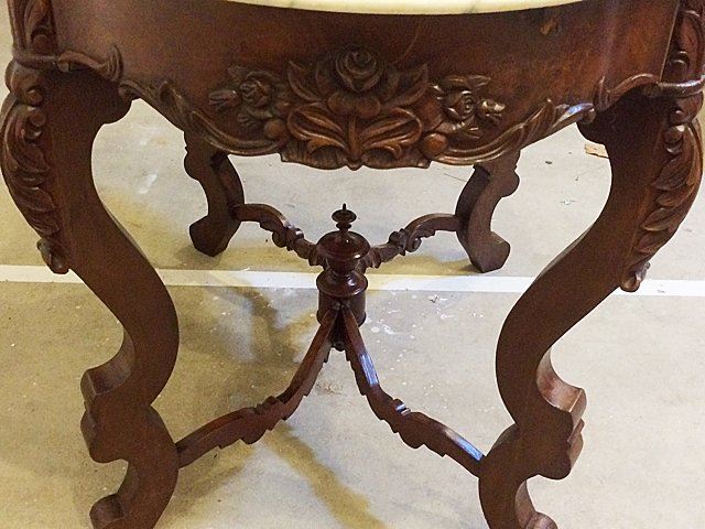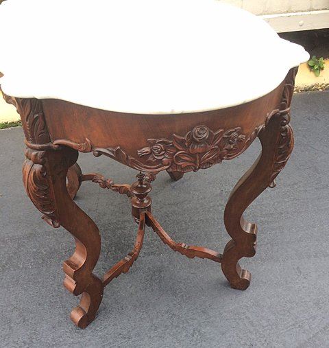 Fabulous Rosewood turtle shaped marble top parlor table with 3 dimentional carved roses all around on the skirts and even on ends, beautiful carved stretcher base with the carved finial in center, nice white carved corona edged marble on top. Measures approx. 39" long x 28" wide x 28" tall