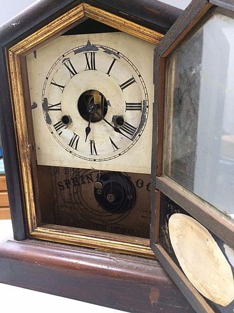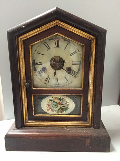 Rosewood Seth Thomas Shelf Clock, Thomaston, CT. Rosewood case with original dial, hands, glass, reverse painted glass with seashell ocean theme, nice label "Thirty-Hour Spring Clock, Made and Sold by Seth Thomas, Thomaston, Conn."