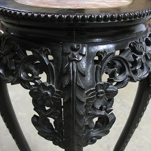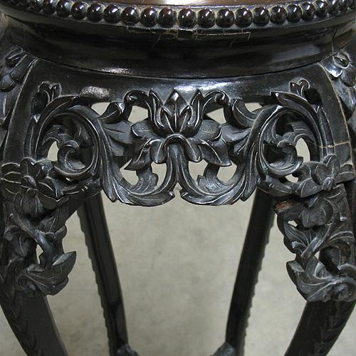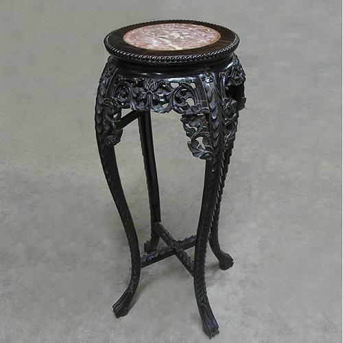 Rosewood oriental stand with inlaid round marble top; bead rim decoration; pierced flower and foliage design on apron and legs; stylized ball and claw feet; mid 20th C.; 37" high x 16" diameter (some trim missing from apron and 1 piece not attached)