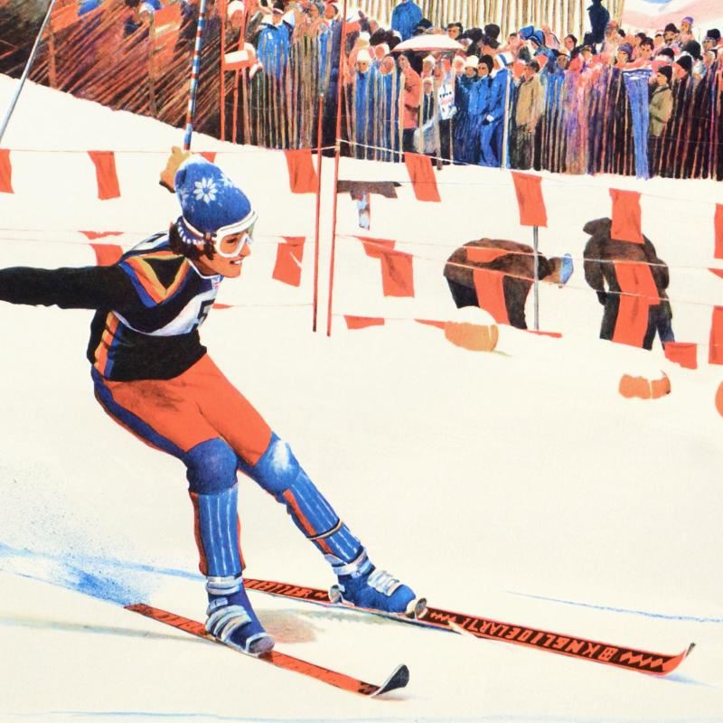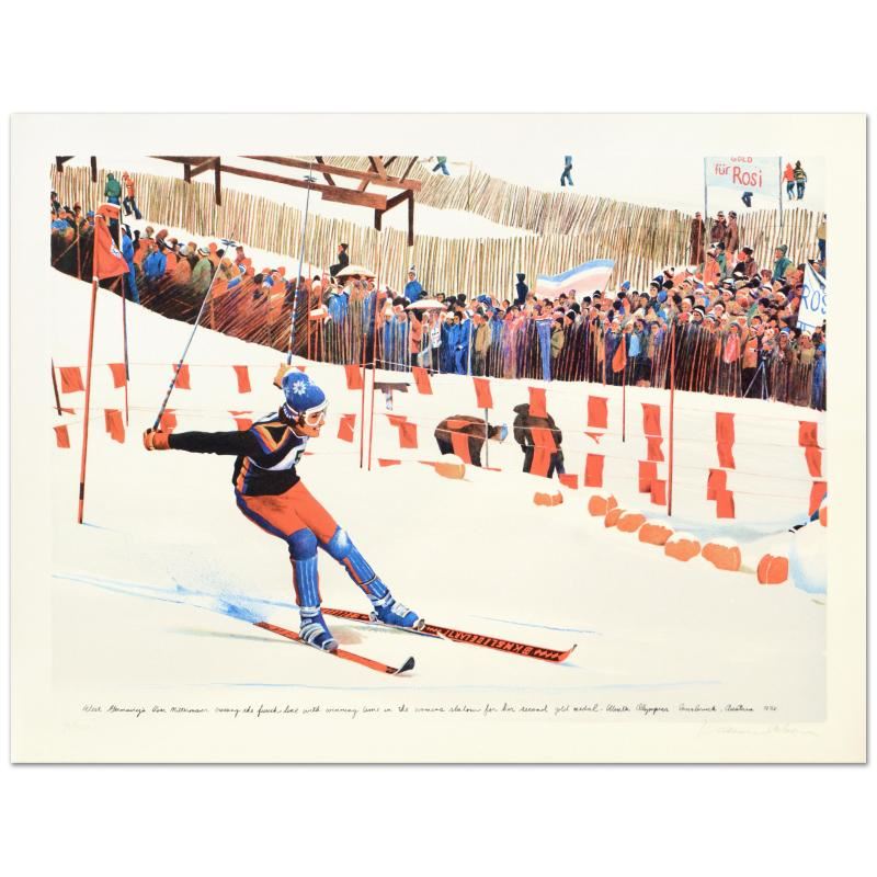 "Rosi Mittermaier" is a limited edition lithograph on paper by William Nelson, numbered and hand signed by the artist! Measures approx. 29" x 22" (with border); 26.5" x 19" (image).