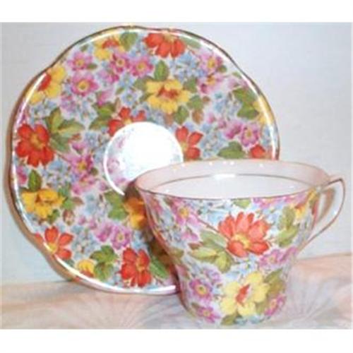 <tr><td>Title:Rosina Bone China Chintz Cup and Saucer</td></tr>