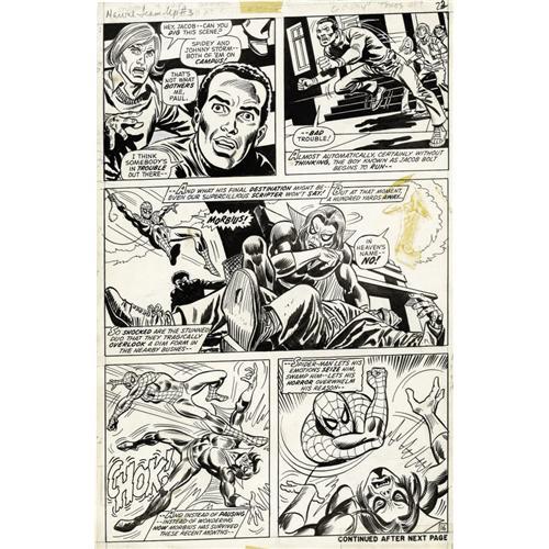 <B>Ross Andru and Jim Mooney - Marvel Team-Up #2, page 16 Original Art (Marvel, 1972).</B></I> Spider-Man lets his horror overwhelm his reason, and begins pummeling the Living Vampire, Morbius, in this page from the Gerry Conway story, "The Power to Purge." This is Morbius' third comic book appearance. The image area measures 10" x 15", and, aside from some tape and glue stains, the condition is Very Good.<BR><BR><b>Shipping:</b> Small Flat (<a target="_blank" href="http://www.heritageauctions.com/common/shipping.php">view shipping information</a>)