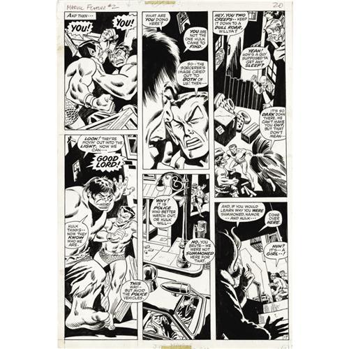 <B>Ross Andru and Sal Buscema - Marvel Feature #2, page 17 Original Art (Marvel, 1972).</B></I> Answering Doctor Strange's summons is one thing, but scaring the bejeebers out of the locals is another thing altogether! Luckily for Sub-Mariner and the Hulk, Clea shows up, in this page from "Nightmare on Bald Mountain," written by Roy Thomas. This art has an image area of 10" x 15", and, aside from a few light printer's ink stains, and a tape stain at the top and bottom edges, the condition is Very Good. <BR><BR><B>Important notice:</B> Heritage usually auctions material at the rate of 200-250 lots per hour. On some occasions eBay Live bid software or the Internet may not be able to keep up with the pace of the auction. We recommend placing a realistic absentee bid now as insurance to avoid disappointment. Occasionally the auctioneer may eliminate or reject an eBay Live bid, and the auctioneer may also reopen a lot after the close of the eBay live bidding (usually because we missed an audience bid), and may reject your bid even if it shows you as the winning bidder. By bidding via eBay Live, you agree that Heritage may award the lot to another bidder at its sole discretion under the circumstances described above or any other reasonable circumstances. Since eBay bids are not shown to us until we open the lot on the floor, we treat those bids just like floor bids. In most cases the floor responds before the eBay bid is presented to us, due to Internet lag time, so for consistency we have made it a policy that floor bids are always considered first over tie eBay live bids. Also please note that all Heritage lots purchased through eBay Live carry a 22.5% Buyer's Premium. Please make sure you read the Terms and Conditions before you bid. This lot is being auctioned in conjunction with a live floor auction by Heritage Auction Galleries. All final auction and invoice information will be supplied by Heritage Auction Galleries, and all other information should be considered preliminary. Lot:41001 <BR><BR><B>Winning Notification and Billing:</B> After the FINAL session in this auction is complete, Heritage will send e-mail and snail mail invoices. This process normally takes several days. All final auction and invoice information will be supplied by Heritage Auction Galleries, and all other information should be considered preliminary. <BR><BR>This auction will be conducted on a live auction floor and over the Internet through eBay Live. If you choose to place an absentee bid, please take a moment to <font color='#0000ff'><u><a href='http://pages.ebay.com/liveauctions/help/before/laabsentee.html'>learn how eBay Live absentee bidding works</a></u></font><font color='#000000'>