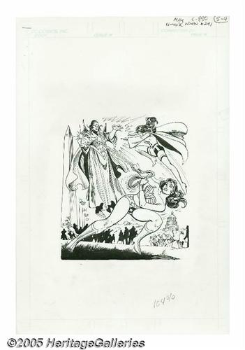 <B>Ross Andru and Dick Giordano - Wonder Woman #291 Cover Original Art (DC, 1982).</B></I> Set against the city of Washington, D. C., Wonder Woman uses her magic lasso on a strange giant being called the Adjudicator, a cosmic being who wants to destroy life as we know it. In the background, Zatanna attacks, brandishing a magic spell, which seems to have no effect on him. A classic <B>WW</B></I> cover, penciled by Ross Andru, and inked by Dick Giordano, this small, but powerful piece has an image area of 7" x 8" and is in Excellent condition.