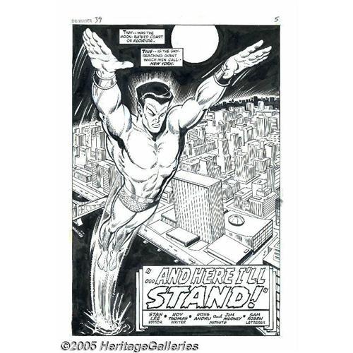 <B>Ross Andru and Jim Mooney - Sub-Mariner #39, Splash Page 4 Original Art (Marvel, 1971).</B></I> Talk about a splash page! The Prince from Atlantis, makes his big city appearance in the sky-reaching giant men call New York, in this super-colossal splash page. Here is one of Marvel's mightiest mainstays, the short-fused Sub-Mariner, direct from the lost island of Atlantis, courtesy of penciler Ross Andru and inker Jim Mooney. The image area measures 10"" x 15"" and the work is in Excellent condition. <BR><BR><B>Important notice:</B> Heritage usually auctions material at the rate of 200-250 lots per hour. On some occasions eBay Live bid software or the Internet may not be able to keep up with the pace of the auction. We recommend placing a realistic absentee bid now as insurance to avoid disappointment. Occasionally the auctioneer may eliminate or reject an eBay Live bid, and the auctioneer may also reopen a lot after the close of the eBay live bidding (usually because we missed an audience bid), and may reject your bid even if it shows you as the winning bidder. By bidding via eBay Live, you agree that Heritage may award the lot to another bidder at its sole discretion under the circumstances described above or any other reasonable circumstances. Since eBay bids are not shown to us until we open the lot on the floor, we treat those bids just like floor bids. In most cases the floor responds before the eBay bid is presented to us, due to Internet lag time, so for consistency we have made it a policy that floor bids are always considered first over tie eBay live bids. Also please note that all Heritage lots purchased through eBay Live carry a 20% Buyer's Premium. Please make sure you read the Terms and Conditions before you bid. This lot is being auctioned in conjunction with a live floor auction by Heritage Galleries & Auctioneers. All final auction and invoice information will be supplied by Heritage Galleries & Auctioneers, and all other information should be cons