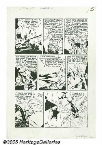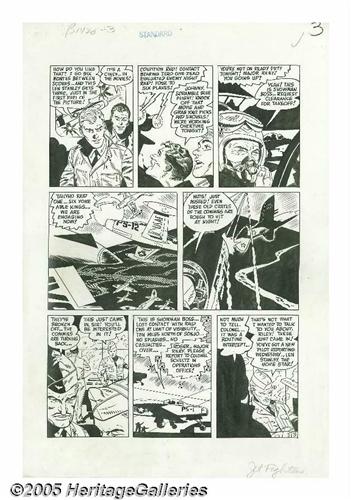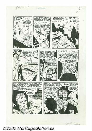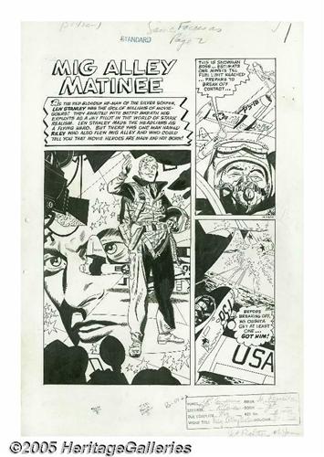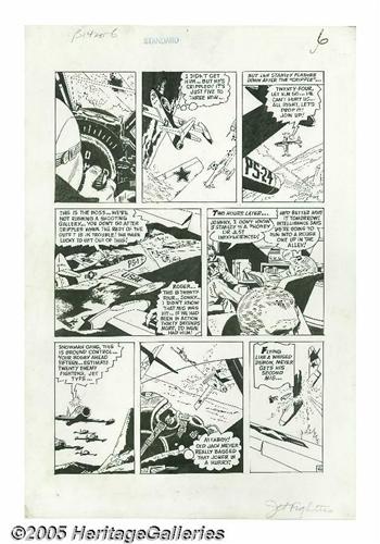 <B>Ross Andru and Mike Esposito - Jet Fighters #6, Complete 7-page Story, "MIG Alley Matinee" (Standard, 1953).</B></I> Standard Comics adopted the design-oriented approach of Alex Toth for its "house style" and two artists who could accommodate that look perfectly were the talented team of Ross Andru and Mike Esposito. In this hard-hitting yarn, movie star Len Stanley is recalled to active duty and when he sees a chance for publicity by shooting down a MIG, he takes it even though it costs the life of his wing man. The image area of each page is 12" x 18" and aside from edge wear and a few lettering corrections, the art is in Excellent condition.