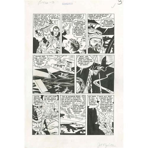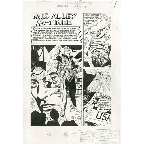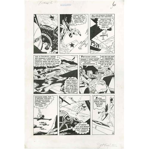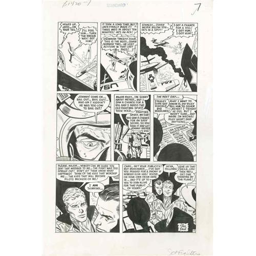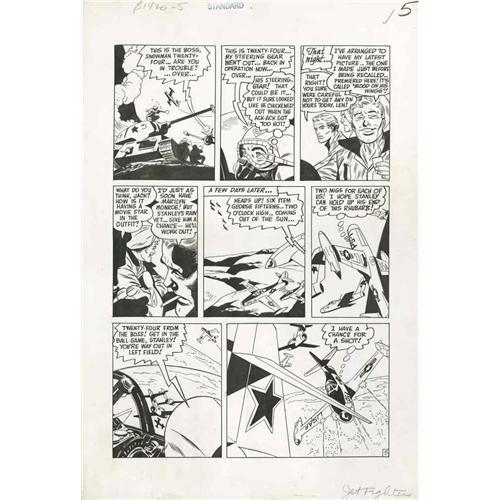 <B>Ross Andru and Mike Esposito - Jet Fighters #6, Complete 7-page Story, "MIG Alley Matinee" (Standard, 1953).</B></I> Standard Comics adopted the design-oriented approach of Alex Toth for its "house style" and two artists who could accommodate that look perfectly were the talented team of Ross Andru and Mike Esposito. In this hard-hitting yarn, movie star Len Stanley is recalled to active duty and when he sees a chance for publicity by shooting down a MIG, he takes it even though it costs the life of his wing man. The image area of each page is 12" x 18" and aside from edge wear and a few lettering corrections, the art is in Excellent condition.
