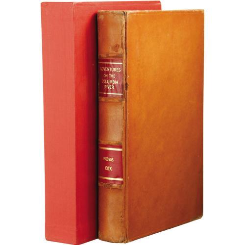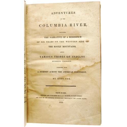 <B>Ross Cox:<I> Adventures on the Columbia River,</B></I></B></I> <I>Including the Narrative of a Residence of Six Years on the Western Side of the Rocky Mountains Among Various Tribes of Indians Hitherto Unknown: Together With A Journey Across the American Continent.</B></I> (New York: J. & J. Harper, 1832), first American edition, 2 pages of ads, 335 pages, later full calf binding and morocco spine labels with gilt titles, 8vo (5.75" x 9"), uniform foxing throughout, some staining to pages, toning at the pastedowns, wear to external hinges, light chipping to edges of boards, else internal contents tight and in very good condition in a slipcase. This work is usually considered as one of the prime source of information on Oregon in the early period.<BR><BR><b>Shipping:</b> Books & Catalogs (<a target="_blank" href="http://www.heritageauctions.com/common/shipping.php">view shipping information</a>)