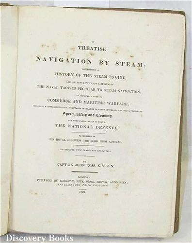 Ross, John. A TREATISE ON NAVIGATION BY STEAM; COMPRISING A HISTORY OF THE STEAM ENGINE, AND AN ESSAY TOWARDS A SYSTEM OF THE NAVAL TACTICS PECULIAR TO STEAM NAVIGATION …… London: Longman, Rees, Orme, Brown, and Green….. 1828 4to. xxiii,182,(2),68pp., 1 plate and several text illus. Original grey papered boards, recent leather spine with raised bands & label, uncut & partially unopened. Boards edge-worn else very good. This copy without frontis portrait.