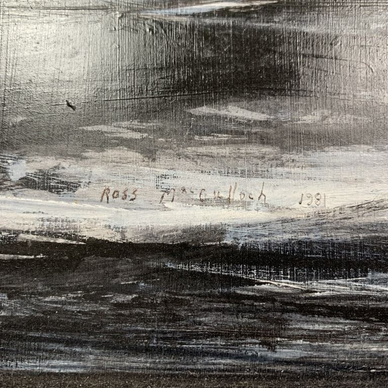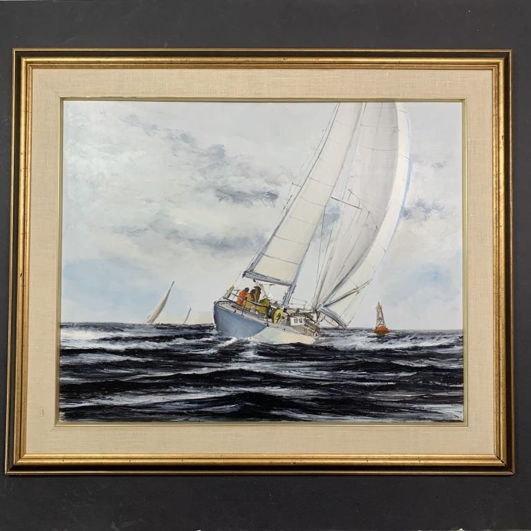 Ross McCulloch's "Sailing in the Harbour", circa 1981, original oil on board, signed and dated lower left. This piece is of a group of people on a sailing ship, in the middle of the ocean. This piece is in excellent condition.