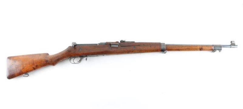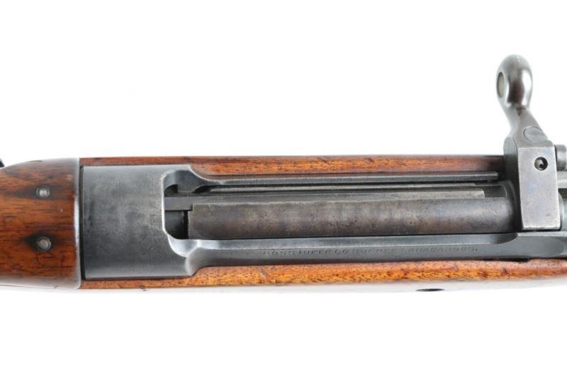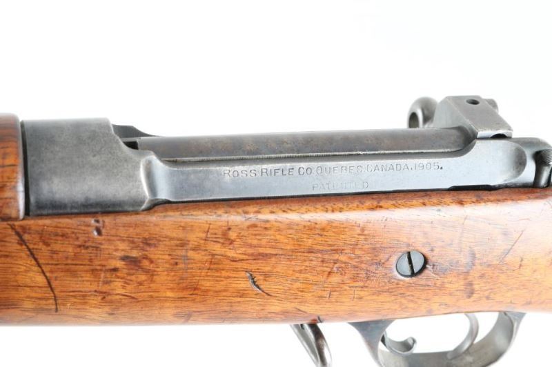 WW 1 era Canadian military rifle chambered for the 303 British cartridge. Straight pull. Features a side mounted lever for depressing the follower of the internal magazine, and a lever in the triggerguard that retracts the cartridge stop to allow rapid unloading. Barrel length is 28 inches, with hooded blade front, and adjustable ladder rear sights. Bore is dark with strong rifling. Retains 60% coverage of dark blue turning brown in some places with handling losses.. Stock is very good with the usual scratches/dings. Right buttstock has Quebec cartouche with Canadian proofs, dated 1909 . Has brass plaque on right buttstock with rack number 20. "U.S". with flaming bomband serial number stamped below triggerguard.. Left receiver rail marked "Ross Rifle Co. Quebec, Canada, 1905". Action is smooth/tight. No import marks observed. Come with 2-claw leather sling, scuffed/worn. Condition is NRA Very Good ***C&R Firearm***