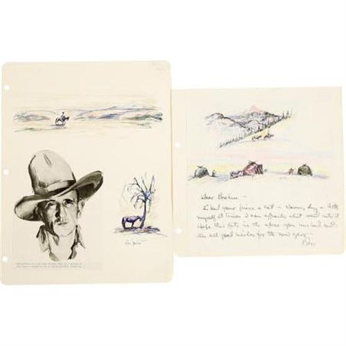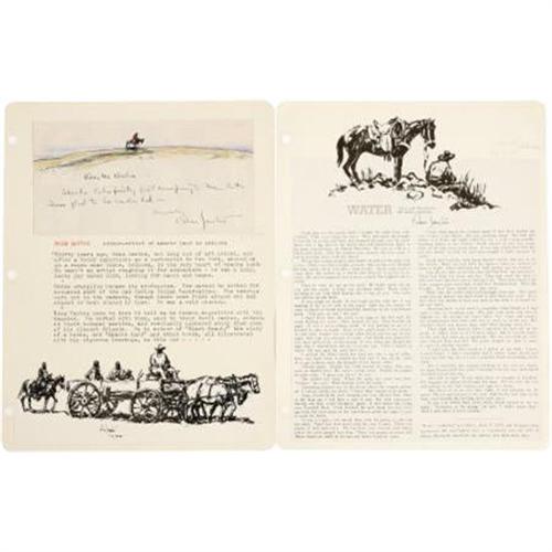 <B>Ross Santee Signed Color Pencil and Ink Sketches,</B></I> Autograph Notes Signed, and a signed article; a great group of items from this noted western artist and author. Santee (1889-1965), to quote his obituary in the <I>New York Times,</B></I> was "...the artist who came to Arizona in 1915 to be a cowboy and stayed to capture the lonely beauties of the state with a pen and brush... This was the chronicler of the old Southwest, whose sketches of lithe horses and burly buffaloes, of the arid grandeur he saw in the desert country, filled the pages of many magazines and became the illustrations for several books. They also gave the world a graphic idea of what the Southwest and its men were really like." Included in this lot are: two 7.5" x 5.5" ANsS each with a colorful sketch above, mounted lightly to the same cardstock sheet; two additional sketches surrounding a clipped magazine portrait on cardstock, signed once; a third ANS beneath a sketch of an Apache mounted to cardstock containing a biography and clipped magazine illustration; and an illustrated magazine article "Water" signed by Santee. A great lot for the western art collector or dealer with five color sketches included. Fine condition.<BR><BR><b>Shipping:</b> Flat Material, Small (<a target="_blank" href="http://www.heritageauctions.com/common/shipping.php">view shipping information</a>)