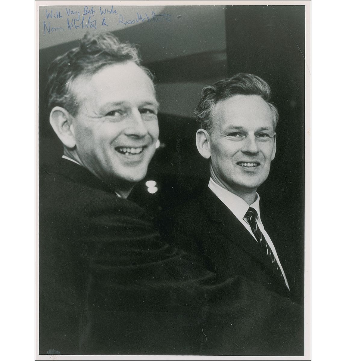 Twin brothers who founded the Guinness Book of World Records. Ross was assassinated by the IRA in 1975. Vintage 6.5 x 8.25 semi-glossy photo of the brothers, signed in blue ballpoint, “With very best wishes, Norm McWhirter &,” and “Ross McWhirter.” In fine condition, with some scattered light spotting to left side of image and some light contrast to end of one signature.