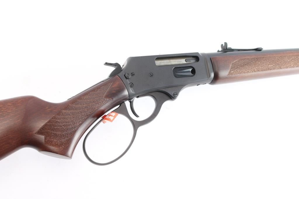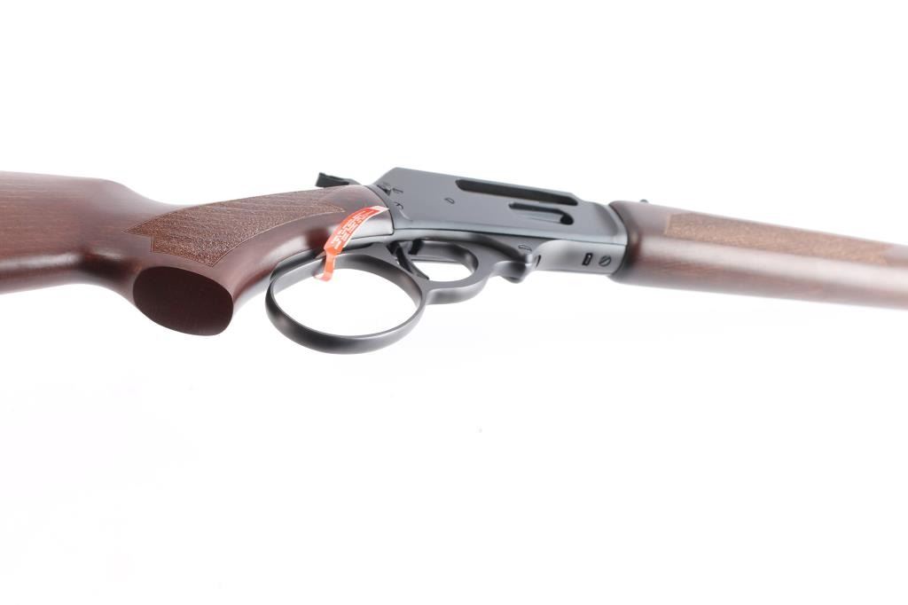 Brazillian made copy of the Marlin 1895, a centerfire lever action carbine chambered for .30-30 Winchester, and introduced in 2023. Imported by Braztech International L.C. out of Bainbridge, GA. Rifle features a blued finish, a 16-1/2" round hammer forged barrel, dovetailed raised blade front sight, elevation adjustable buckhorn rear sight, smooth curved trigger, external hammer with serrated spur, annular cut push-button safety, large lever loop, grip safety, side eject, and flat top receiver that is drilled and tapped for optic mounting. The walnut furniture consists of a semi-pistol grip shoulder stock wth stippling at the wrist, sling stud on the buttstock, solid rubber recoil pad, stippled forend, and sling eye on forend endcap. The original blued finish retained is approximately 99% with nothing remarkable. Metal displays no rust or deformation. The action is smooth and crisp, and the bore is bright with strong rifling. The walnut furniture is also in excellent condition. This rifle includes the original factory cardboard box with end label, owner's manual, and a lock.