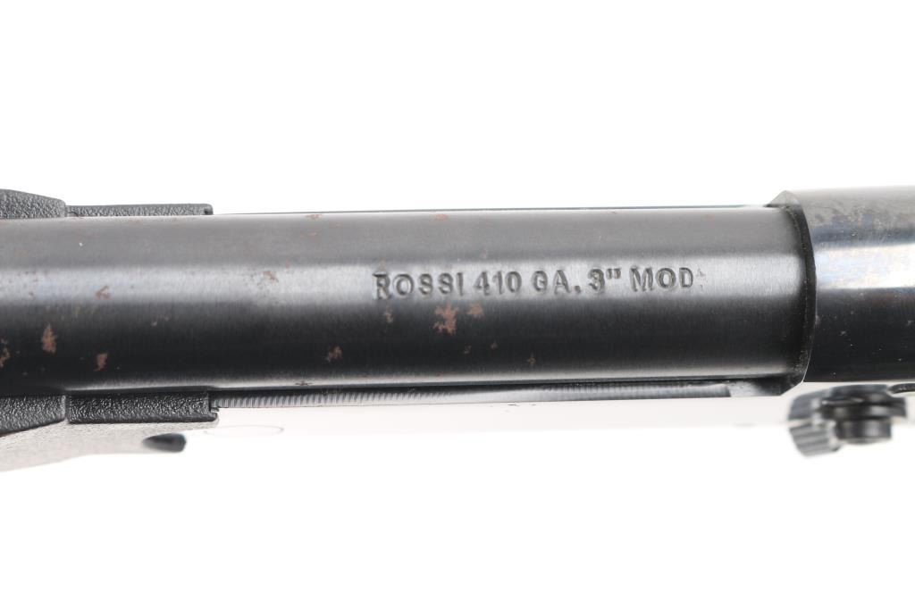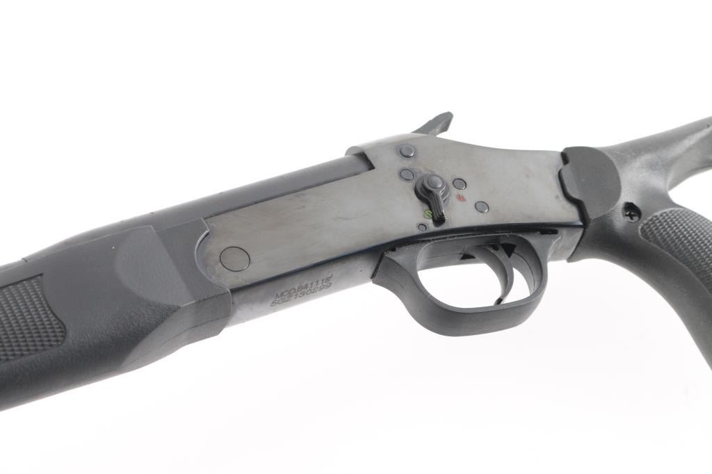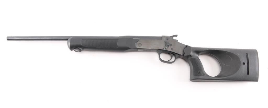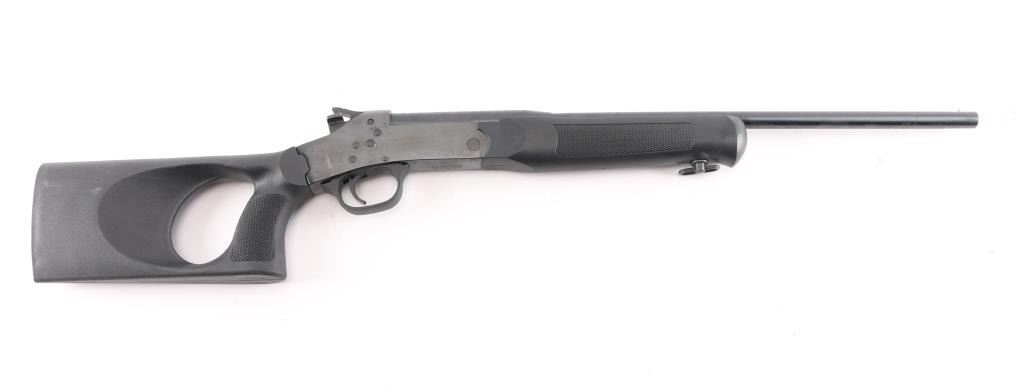 Brazilian made single shot break open shotgun, imported by Braztech, Miami FL. Features blued finish, 18.5" barrel, brass bead front sight. exposed hammer, manual safety, sling swivel on forend, black polymer thumbhole stock with 4-rd shell container in butt. Bore is pristine. Retains 92% blue finish with minor scratches, spots of surface rust on the lower barrel. Includes factory box with matching label.